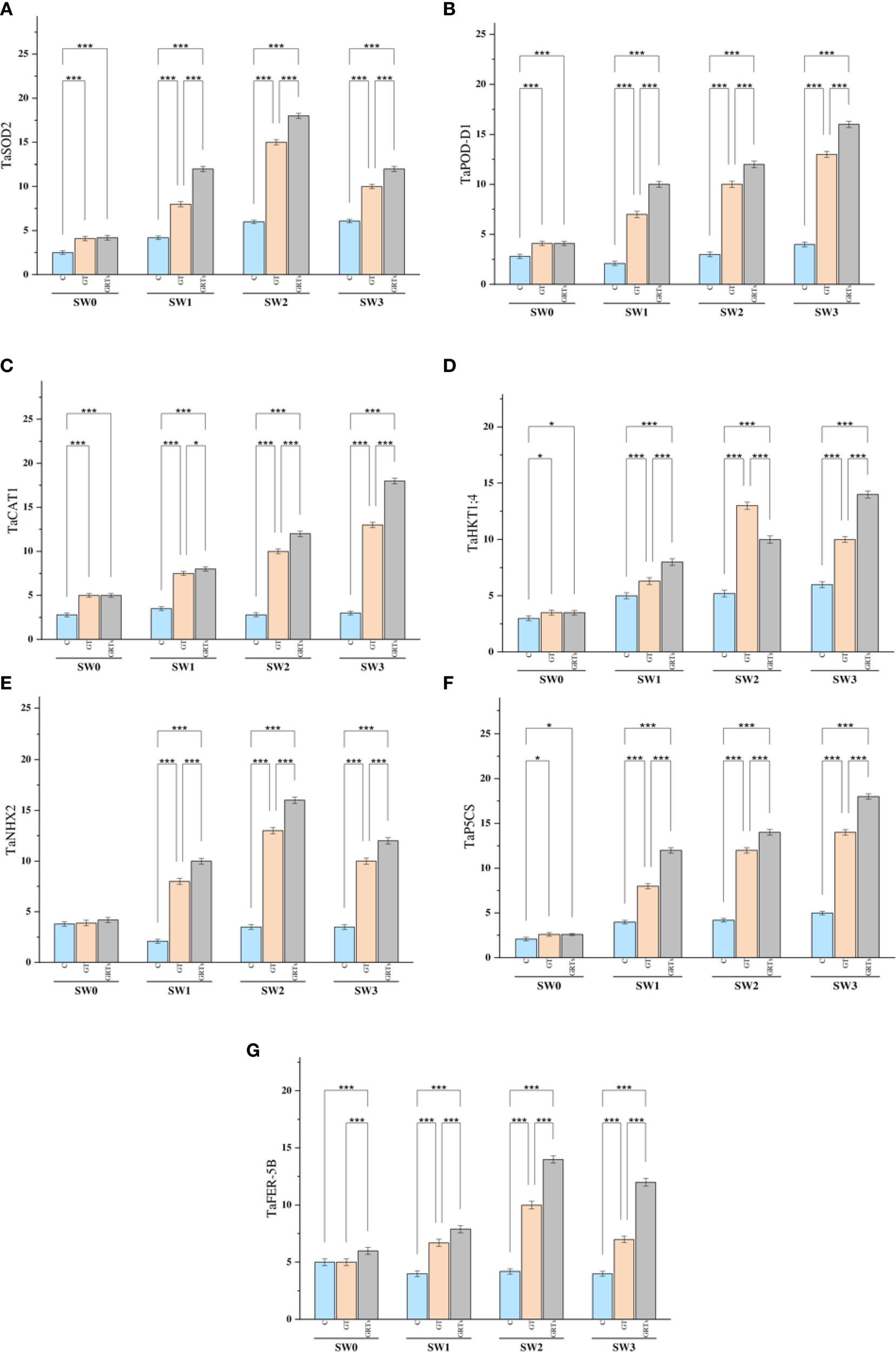 Varying expression patterns of salinity associated genes (TaSOD2, TaPOD-D1, TaCAT1, TaHKT1;4, TaNHX2, TaP5CS and TaFER-5B) under the control treatment, grain treatment, and grain and root treatment by applied biofertilizers under diluted seawater salinity stress in used wheat cultivar (Yecora rojo) at flowering stage (A–G). Values in the graph are means averaged after 6 weeks of stress application at a p-value ≤ 0.05. Statistical significance is indicated by asterisks (*p ≤ 0.05, **p ≤ 0.01, *p ≤ 0.001).