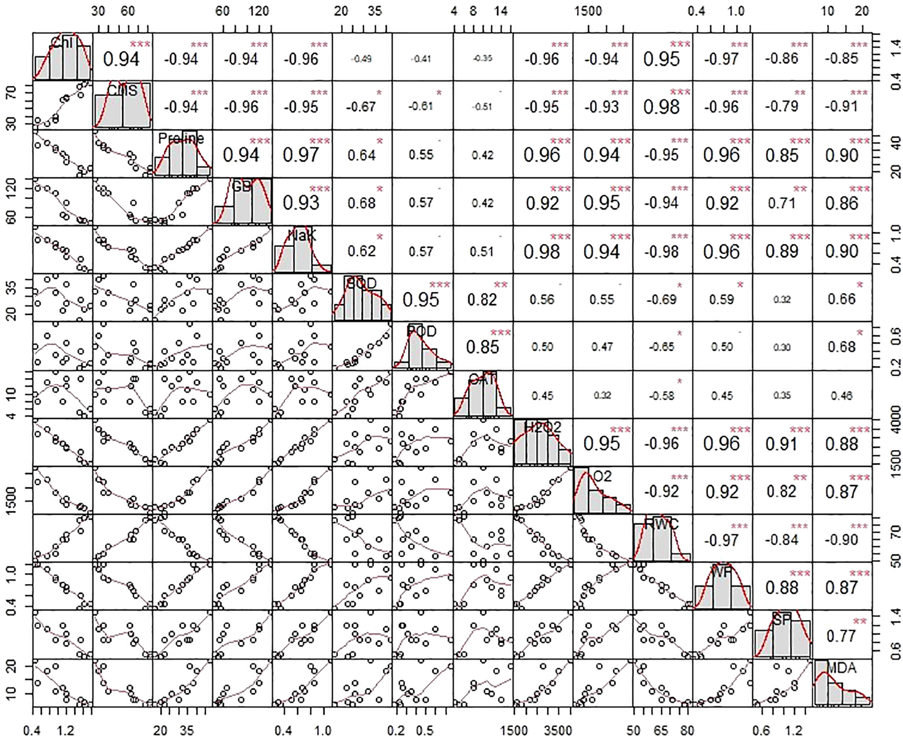 The correlation matrix illustrates the degree of connotation that exists between the physiological characteristics of plants, their water relationships, and the biochemical contents of wheat that has been subjected to salinity stress by seawater (SW) and treated with biofertilizers (BF). The upper matrix shows the Pearson coefficients, and the results were significant at ***p< 0.01, **p< 0.05, or *p< 0.1 as marked. The red solid lines in the lower matrix show a smooth regression between the two factors. CAT, Catalase; POD, Peroxidase; SOD, Superoxide dismutase; Chl, Total chlorophyll contents; CMS, Cell membrane stability; H2O2, Hydrogen peroxide; Pro, Proline; GB, Glycine betaine; MDA, Malondialdehyde; RWC, Relative water content.