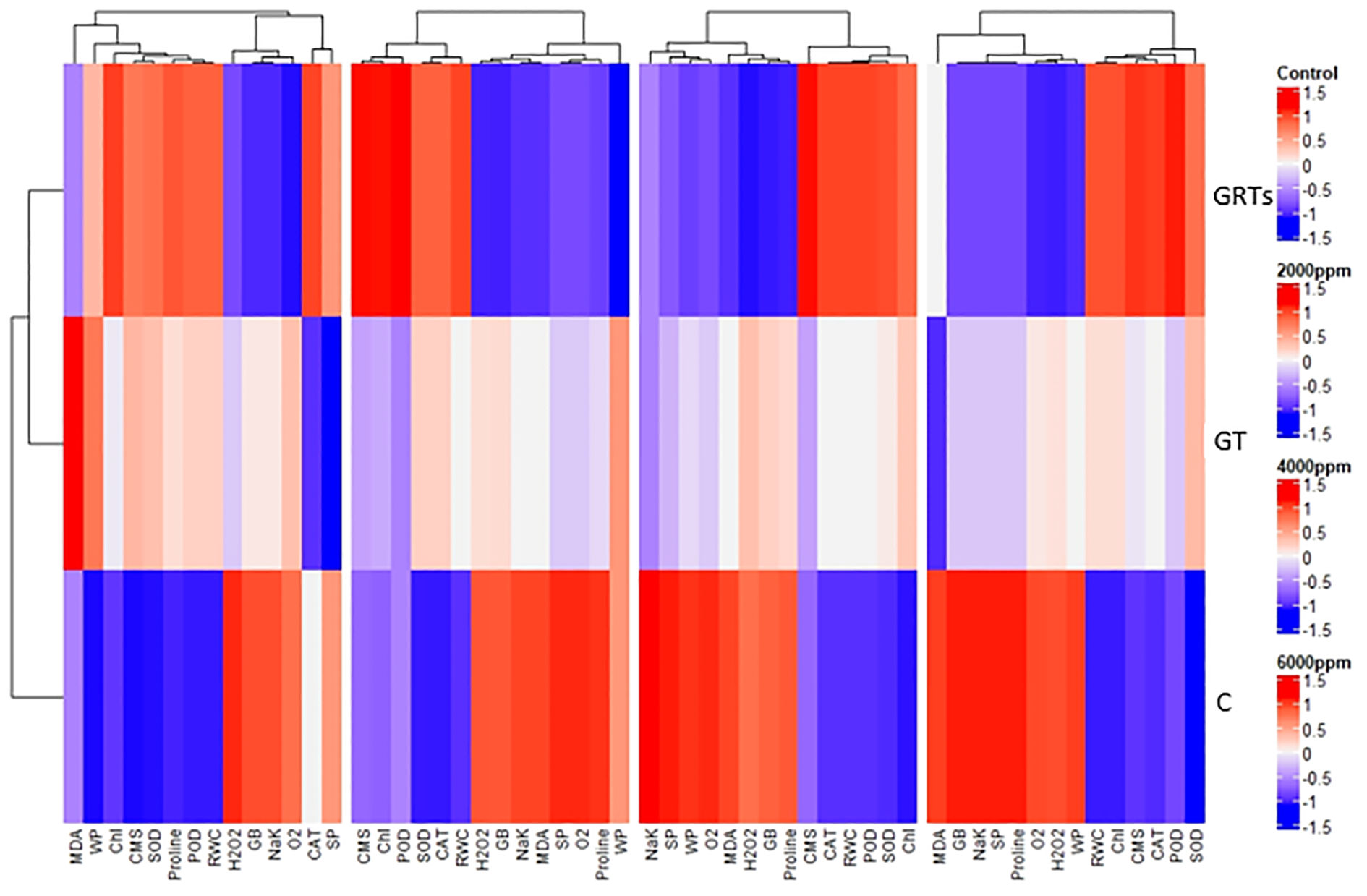 The results of PCA have been further confirmed by heatmap cluster analysis. In Figure 8, the different band patterns and cluster distribution show how the levels of biofilm (BF) change when the salinity stress levels (SW0 = 0 ppm, SW1 = 2000 ppm, SW2 = 4000 ppm, and SW3 = 6000 ppm) are changed. These levels affect the expression and association of chlorophyll (Chl), chloroplast movement (CMS), plant water relations, osmolytes, antioxidant enzymes, and reactive oxygen species (ROS). This is true for the same levels (C: Control, GT: Grain Treatment, GRTs: Grain and Root Treatment) of BF. This shows that different relationships between salinity and BF (salinity x BF) change the way characteristics are correlated and expressed. This was the next step to fix the PCA data. This was also shown by the combined heatmap study, which showed that each interaction between salinity and BF changes how attributes are expressed and linked in different ways. The heatmap analysis confirmed these findings by grouping features based on their link to changes in salt and how plants responded to biofertilizer treatments (Figure 8).