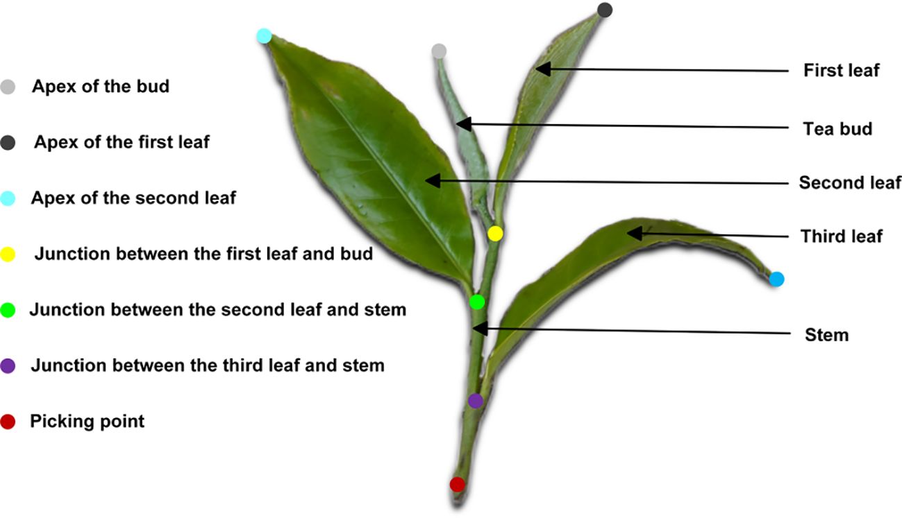 In this study, Labelme was employed for image annotation. To enable fine-grained recognition and localization of Pu-erh tea buds, we adopted a bionic keypoint annotation strategy inspired by techniques in human pose estimation and animal structural analysis. The bud morphology was conceptualized as a human-analogous structure, with geometrically or functionally meaningful regions—such as the apex, base, and middle section—annotated as structural “key joints.” This human-inspired segmentation annotation approach allows the model to effectively learn the geometric topology and spatial constraints among the key structural components of the tea bud. After a thorough review of relevant literature and consultation with agronomic experts, the “one-bud–three-leaf” standard was adopted as the reference for harvesting, based on which the ecological keypoint locations for Pu-erh tea buds were precisely defined, as illustrated in Figure 2. Furthermore, visibility annotations were applied to the picking points: points partially occluded yet inferable from structural cues were marked as “occluded” (visible=1); points heavily occluded (>80%) and indeterminable were labeled as “invisible” (visible=0); while clearly discernible keypoints were designated as “visible” (visible=2). It is noteworthy that no internationally unified criterion exists for defining the picking point. In accordance with stem-harvesting requirements, this study defined the picking point as being 1–2 cm below the intersection between the third leaf and the main stem.