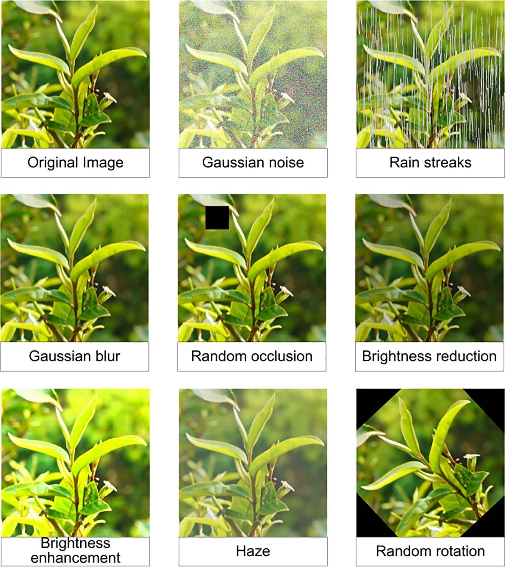 To improve the diversity and robustness of the Pu-erh tea bud image dataset and to address the limitations of insufficient samples and monotonous scene representation, this study integrated a comprehensive suite of image augmentation techniques (Bijelic et al., 2020; Shorten and Khoshgoftaar, 2019). Rain streaks, fog, and Gaussian noise were introduced to emulate complex environmental interferences, while brightness and exposure adjustments simulated diverse lighting conditions, as shown in Figure 3. Additionally, Gaussian blurring was applied to mimic imaging defocus, thereby enhancing the model’s resilience to real-world visual variability. Through rotation transformations and mirror flipping, the dataset was enriched with multi-perspective variations, strengthening the model’s capacity to recognize targets under diverse orientations and postures. Artificial occlusions were simulated by introducing black rectangular patches, which improved the model’s robustness and detection reliability under conditions of partial target obstruction. A label-synchronized transformation mechanism was further implemented to ensure perfect alignment between augmented images and their corresponding annotations. These augmentation strategies significantly expanded the dataset, furnishing a richer and more representative sample base for deep learning model training. This enhancement greatly improved the model’s generalization capability and stability in Pu-erh tea bud detection and recognition tasks. After augmentation, a total of 5,000 valid images were generated and randomly partitioned into training, testing, and validation subsets in a 7:2:1 ratio using Python scripts. Figure 4 presents representative examples of images produced using the aforementioned augmentation techniques, illustrating the diversity and realism achieved through this process.