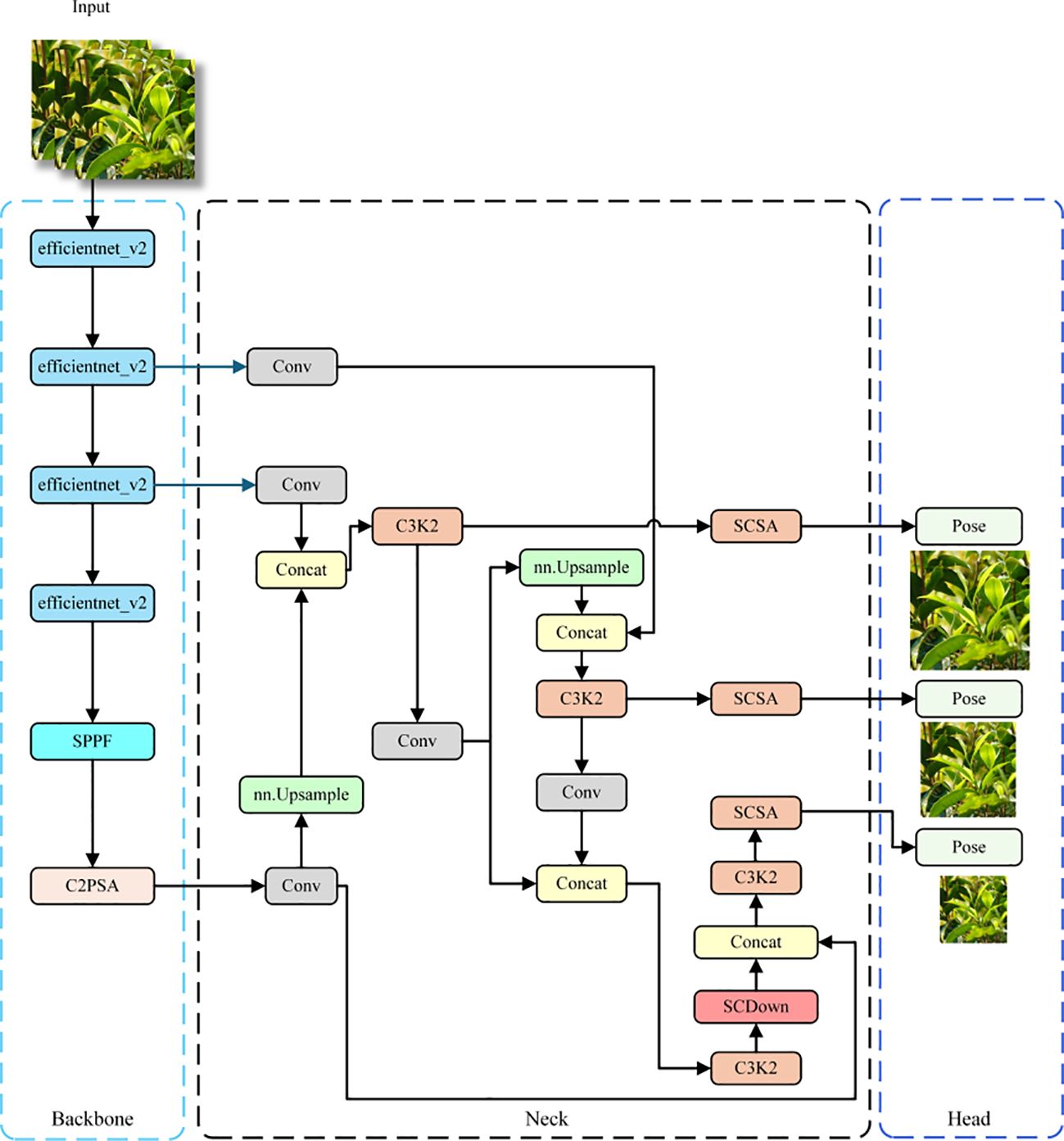 YOLOv11, the latest generation in the YOLO family of lightweight real-time object detectors, achieves an exceptional balance between accuracy and computational efficiency, and has been extensively adopted across diverse intelligent vision applications (Khanam and Hussain, 2024). Building upon this framework, YOLOv11-Pose integrates an advanced keypoint regression module, allowing the network to perform not only bounding-box detection but also precise localization of internal structural keypoints, thereby extending its applicability to keypoint-intensive domains such as human pose estimation and agricultural structural analysis. Nevertheless, YOLOv11-Pose exhibits several limitations when applied to tea bud detection — its performance tends to degrade under complex backgrounds, low image quality, or drastic illumination changes, and it demonstrates limited robustness when dealing with small-scale or heavily occluded targets. To enhance its adaptability across diverse environmental conditions, this study proposes a structural optimization of YOLOv11-Pose, aimed at improving its recognition and localization capabilities for complexly structured tea buds, particularly within interference-prone and visually ambiguous Pu-erh tea harvesting environments. To overcome these limitations, this work introduces three major architectural enhancements: an EfficientNetV2 backbone for optimized feature encoding, a CSFF (Cross-Scale Feature Fusion) module for multi-scale feature enhancement, and an SCSA (Spatial–Channel Synergistic Attention) module for refined feature modeling. Collectively, these components constitute the ECS-Tea framework—a lightweight, high-efficiency, and robust detection network tailored for complex Pu-erh tea bud recognition.