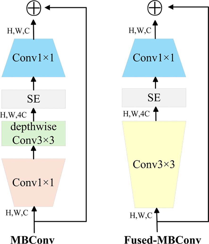 EfficientNetV2 leverages training-aware Neural Architecture Search (NAS) and scaling strategies to optimize model performance. It was designed to overcome the training bottlenecks observed in EfficientNet (Tan & Le, 2020). In particular, it addresses inefficiencies in training large image sizes, low computational efficiency in deep convolutions within early layers, and the limitations of uniform scaling. Furthermore, progressive learning is applied during training. Regularization strength is adaptively scaled based on image size: initially, small images and weak regularization are used, while in later training phases, larger image sizes and stronger regularization are employed. The Fused-MB Conv structure is illustrated in Figure 5 (Li et al., 2021). The architecture of EfficientNetV2 is detailed in Table 1.