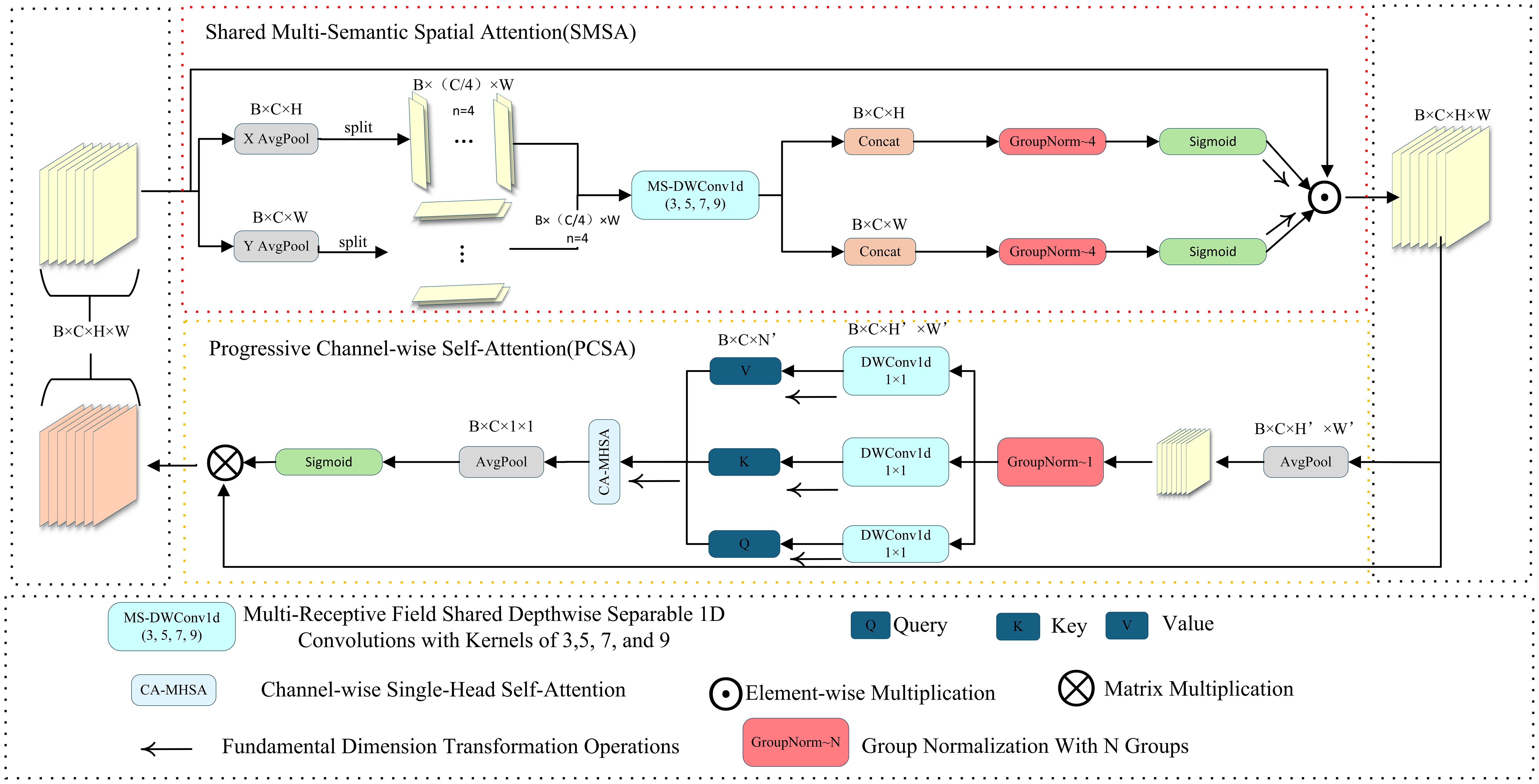 The SCSA module draws inspiration from CBAM and CPCA, yet introduces targeted innovations in the mechanisms of spatial–channel interaction and feature fusion to better suit the requirements of fine-grained perception (Woo et al., 2018; Huang et al., 2024).Structurally, it comprises two components—Shared Multi-Semantic Spatial Attention (SMSA) and Progressive Channel-wise Self-Attention (PCSA)—whose overall architecture is depicted in Figure 7. Unlike conventional serial attention schemes, SCSA employs a bidirectional spatial–channel collaborative modeling strategy that jointly optimizes spatial and channel representations, thereby preserving salient feature information while effectively suppressing background noise.