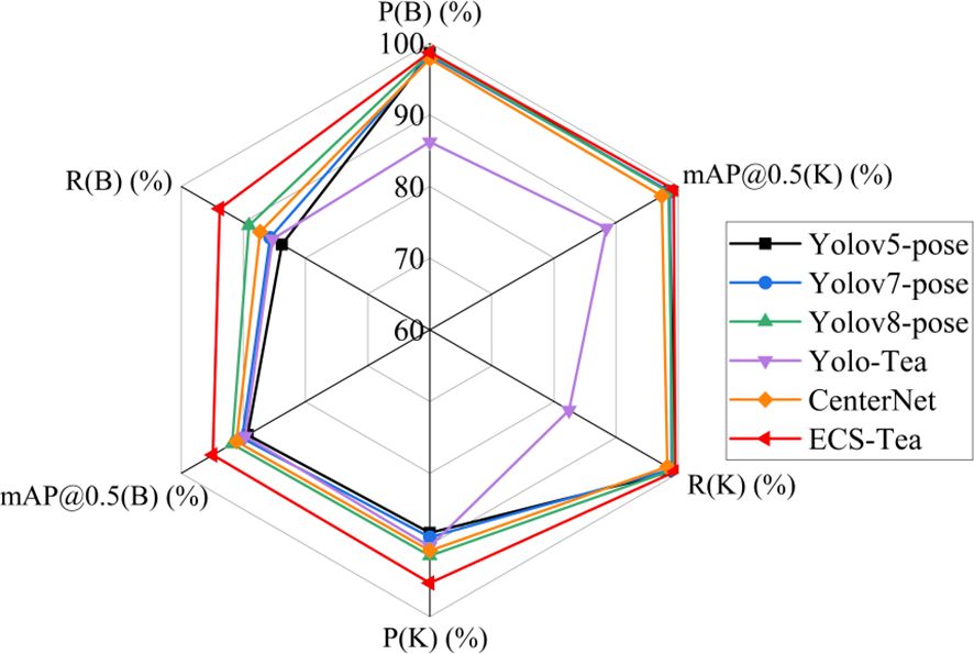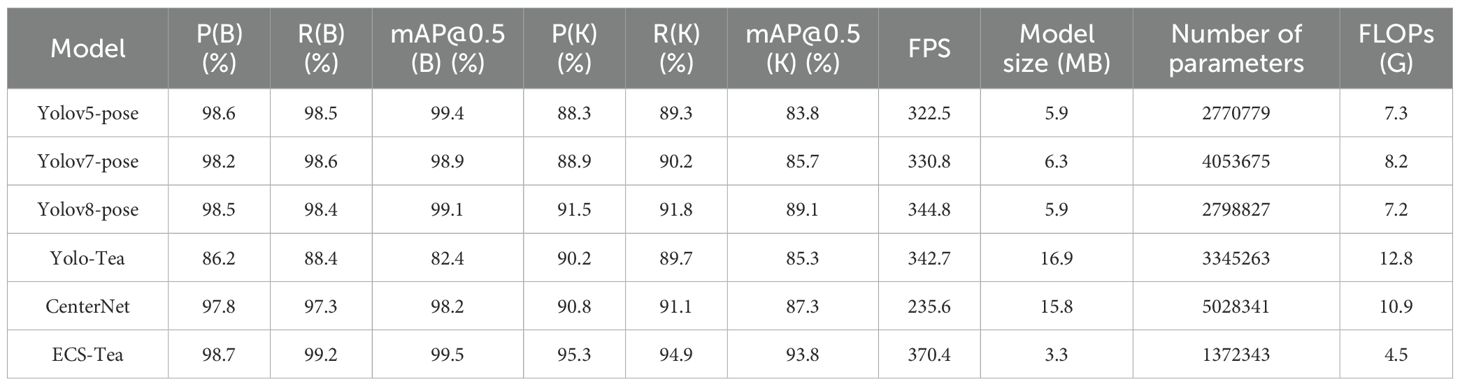 To rigorously assess the effectiveness and superiority of the proposed ECS-Tea model, we conducted comparative experiments using identical datasets, augmentation strategies, and hyperparameter settings. The baselines comprised YOLOv5-pose, YOLOv7-pose, YOLOv8-pose, YOLO-Tea, and CenterNet, with ECS-Tea evaluated as the optimized reference model. YOLOv5-pose adopts a compact and robust architecture that exemplifies early efficient designs for joint object–keypoint detection. Building upon this, YOLOv7-pose and YOLOv8-pose improve localization accuracy and inference speed through enhanced feature aggregation and decoupled multi-scale detection heads. To enhance the completeness of comparison, we also incorporated YOLO-Tea—a model specifically designed for tea leaf detection—and CenterNet, a non-YOLO keypoint detection framework, serving as domain-specialized and cross-framework benchmarks.