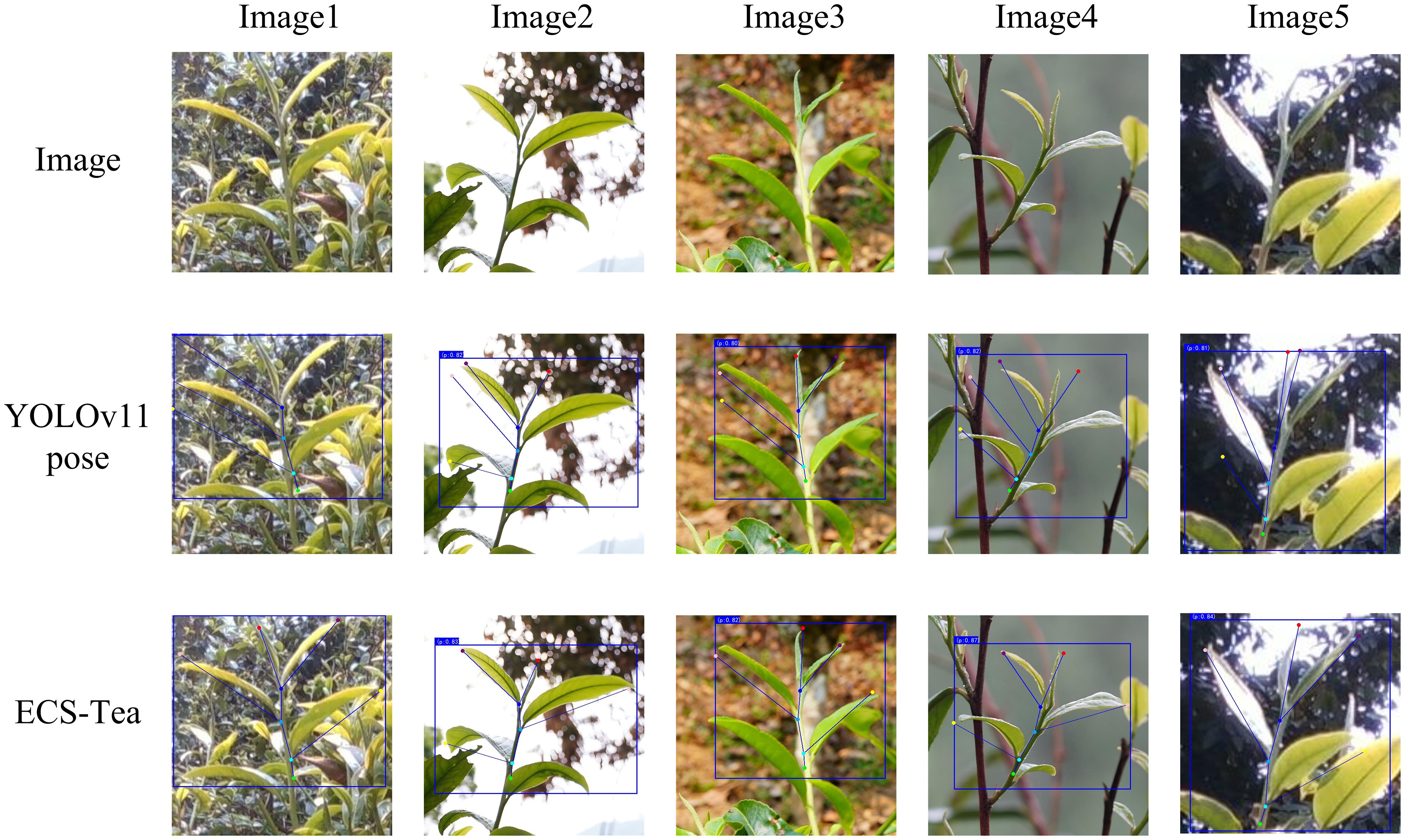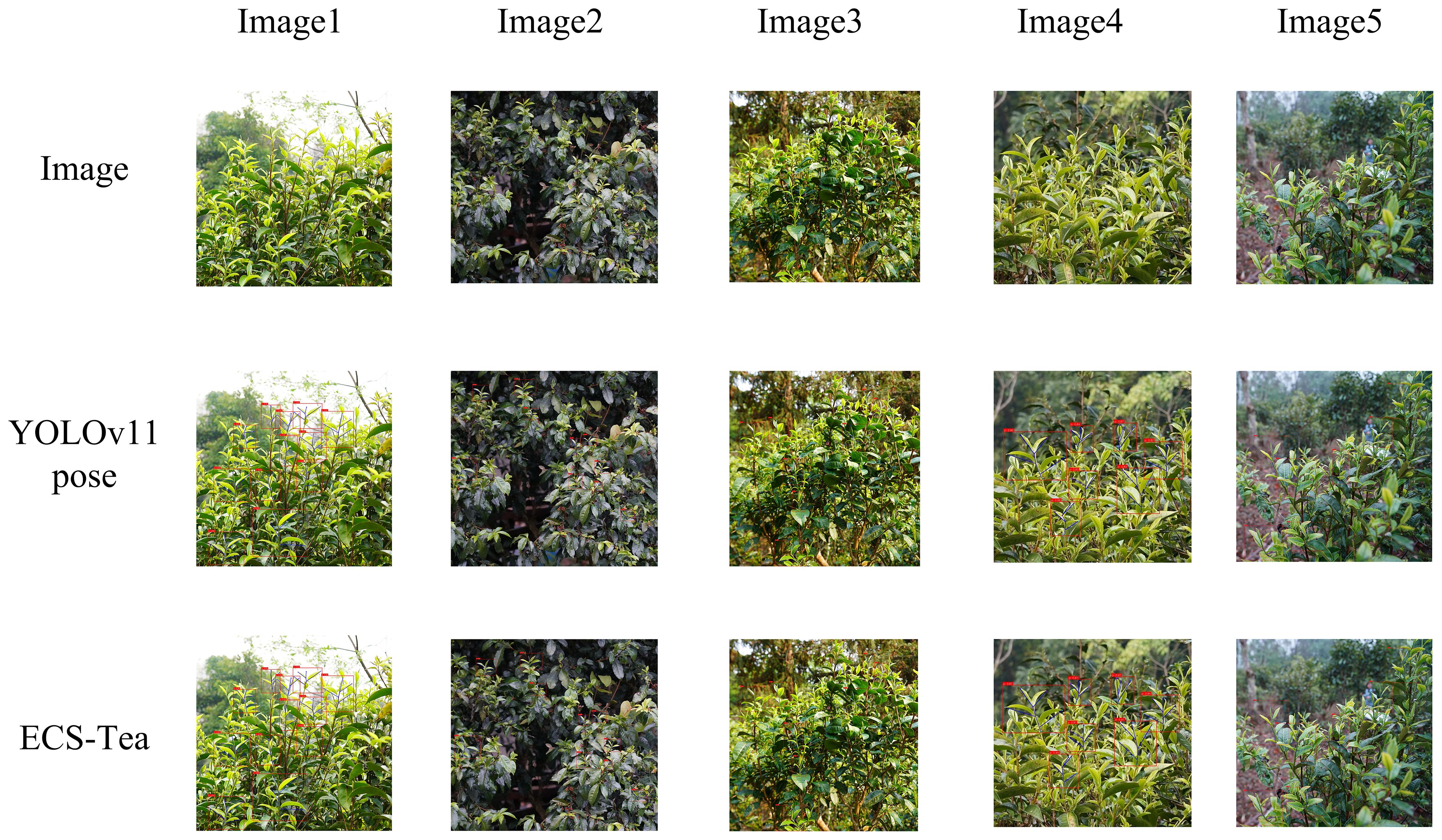 Results: Experimental results show that ECS-Tea achieves 98.7% target detection accuracy and 95.3% keypoint detection accuracy, with a compact architecture (3.3 MB), low computational cost (4.5 GFLOPs), and high inference speed (370.4 FPS). Compared to the baseline YOLOv11-Pose, ECS-Tea significantly improves keypoint detection performance: mAP@0.5(K) increases by 4.9%, recall R(K) by 3.8%, and precision P(K) by 3.4%, while maintaining or slightly enhancing object detection metrics.
