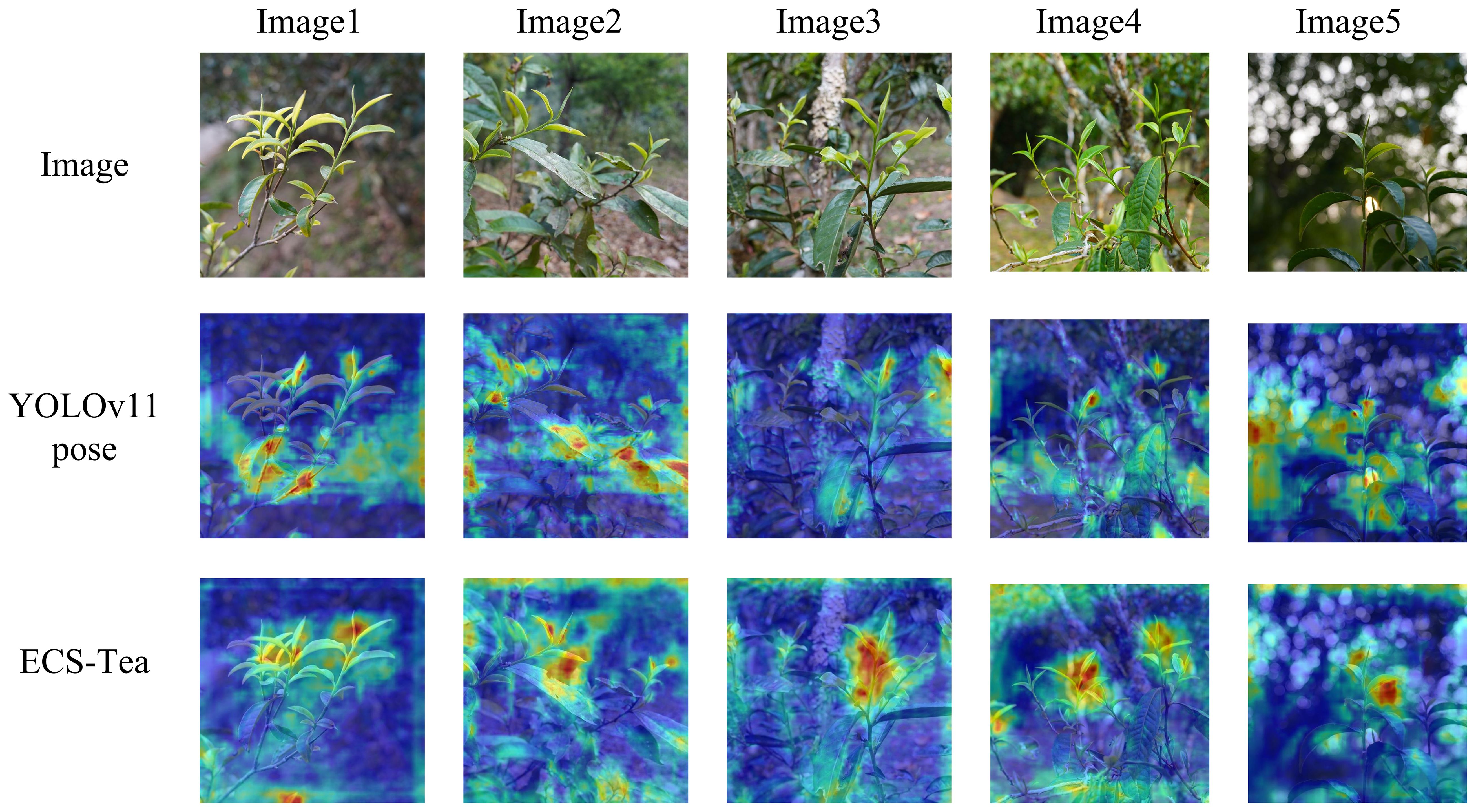 Figure 11 depicts a Grad-CAM heatmap comparison between the two models across the entire image. The ECS-Tea model demonstrates tightly focused attention on the target body with smooth boundary transitions, suggesting that it more effectively captures high-level semantic representations and achieves clearer separation between foreground and background regions. In contrast, the YOLOv11-Pose model exhibits a dispersed and unfocused attention distribution, with misaligned activations frequently occurring around branch–leaf intersections or background clutter. This behavior reveals an overreliance on low-level texture cues, resulting in incomplete target perception and spatial localization deviations, particularly in visually complex environments.
