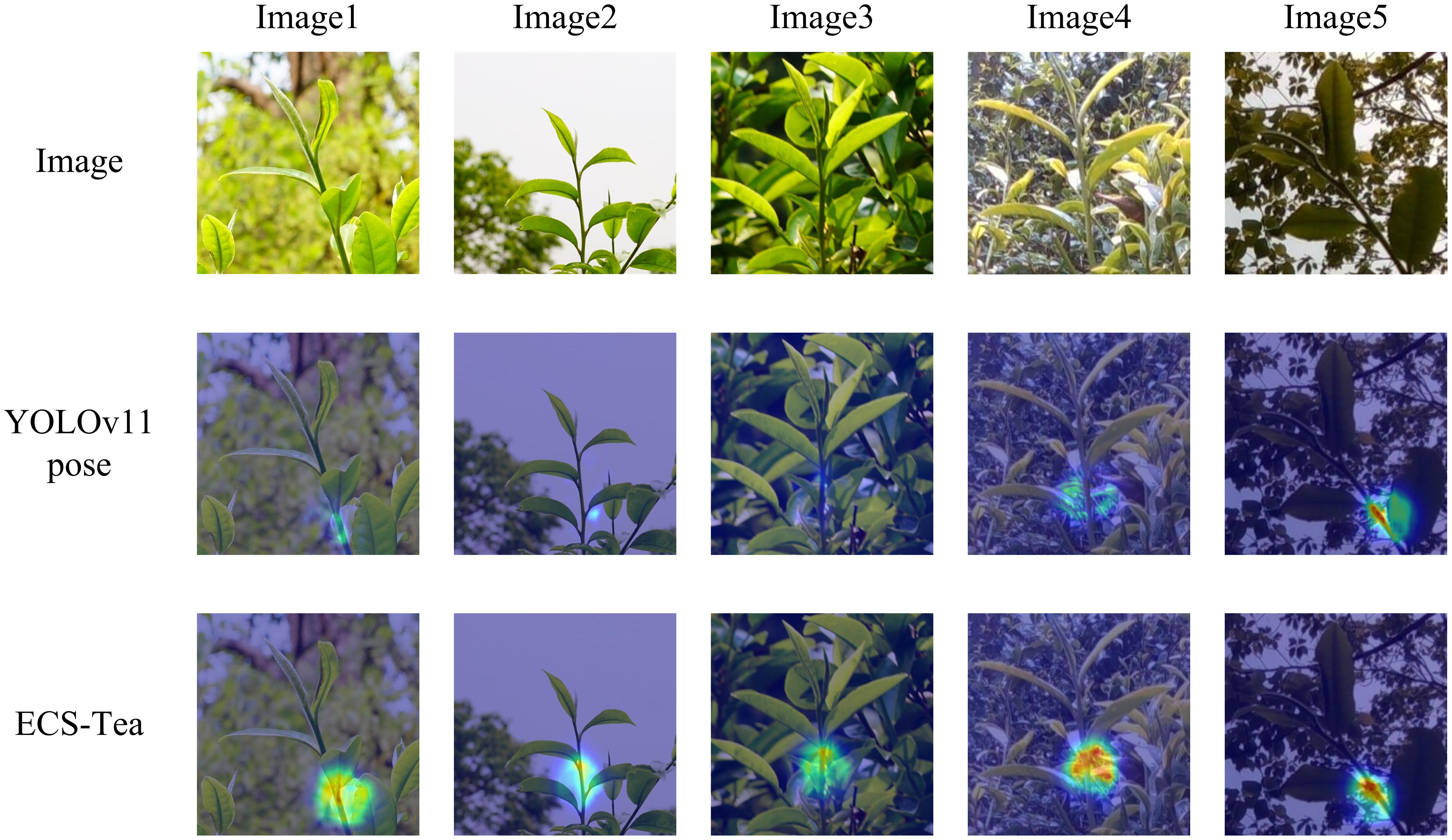 Figure 12 highlights the Grad-CAM heatmaps centered on picking keypoint regions, aimed at assessing the model’s fine-grained perceptual capacity in operationally critical areas. The results reveal that the ECS-Tea model produces highly concentrated and strongly activated responses around picking points, suggesting enhanced geometric sensitivity to structural details and superior semantic alignment in the representation of key regions. By contrast, the baseline YOLOv11-Pose model displays a diffuse and misaligned attention distribution, often focusing on irrelevant regions such as leaves or branches, implying limited perceptual sensitivity to actual operational targets and weaker structural discrimination. This distinction further underscores that the ECS-Tea model excels not only in macro-scale object recognition but also in micro-scale keypoint comprehension, achieving greater precision and temporal stability. Such performance establishes a robust perceptual foundation for subsequent automated picking and manipulation tasks.