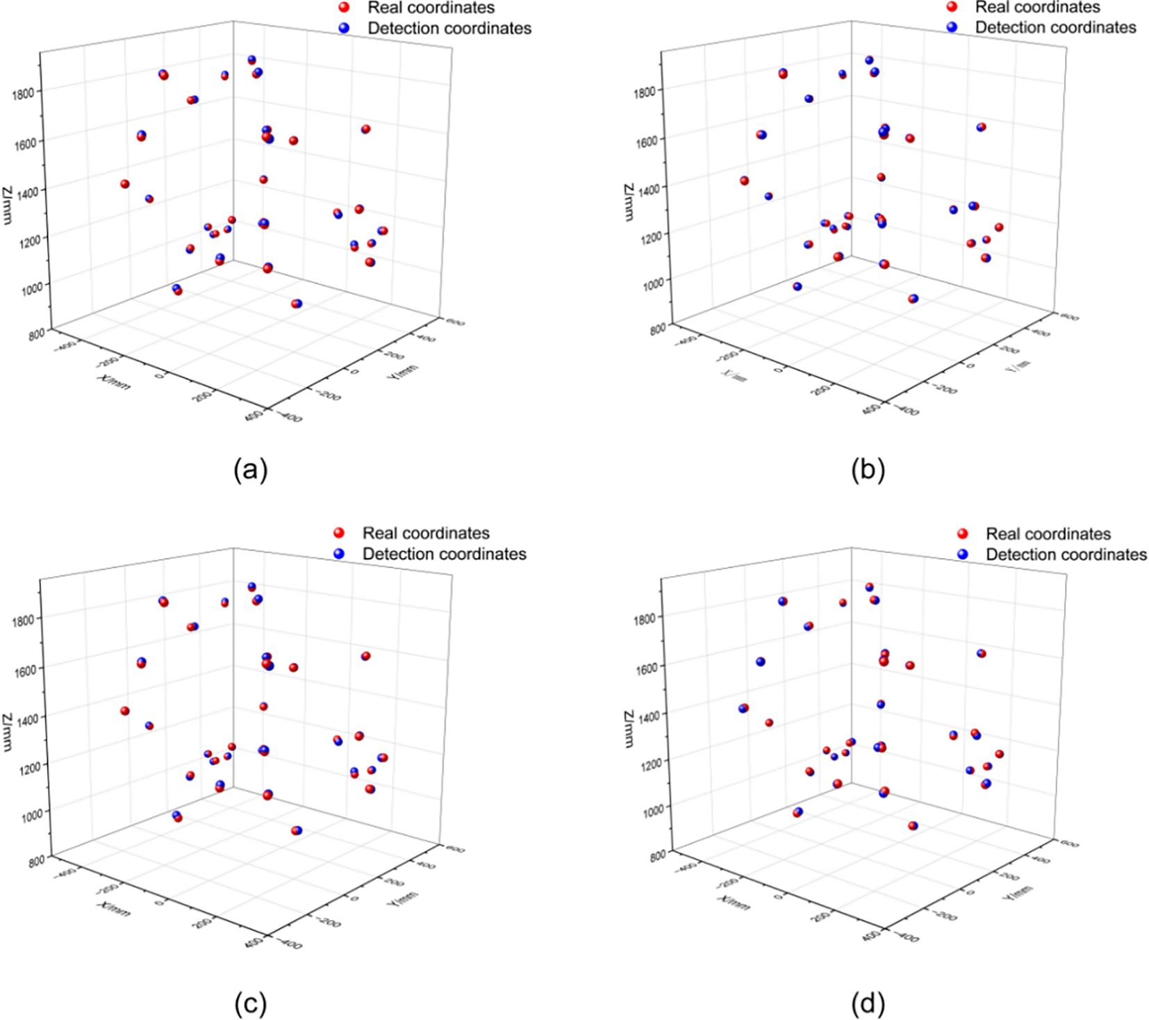 A set of comparative experiments was designed to evaluate 3D keypoint localization error and the system’s robustness under four different strategies, with the 3D spatial localization results under a fixed ground-truth coordinate set presented as shown in Figure 14.