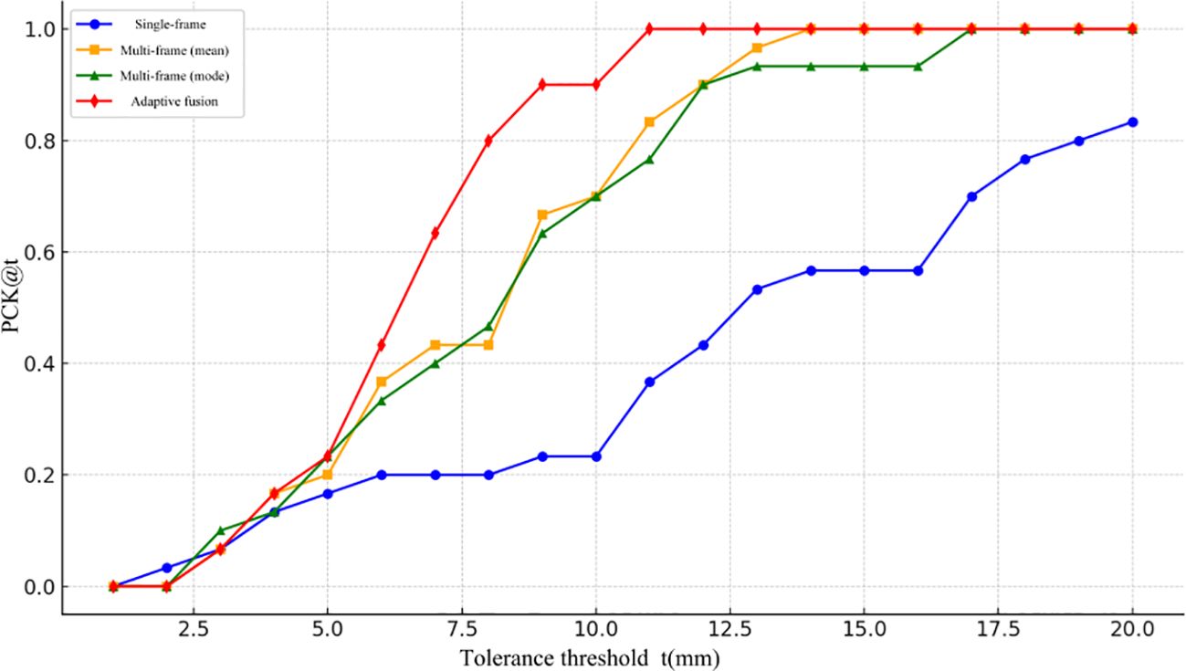 To more precisely assess the accuracy of different 3D localization approaches under varying error tolerance thresholds, this study plotted the PCK (Percentage of Correct Keypoints) curves, as illustrated in Figure 15. The x-axis represents the error threshold (t, in mm), while the y-axis indicates the proportion of keypoints whose prediction error falls below that threshold, namely PCK@t. To enhance the curve’s resolution and smoothness, the threshold interval was set to 0.5 mm, meaning one PCK value was sampled for every 0.5 mm increment. As shown, the proposed adaptive multi-frame fusion strategy consistently achieves superior localization accuracy across all threshold levels, demonstrating its robustness and applicability in real-world tea-picking scenarios.