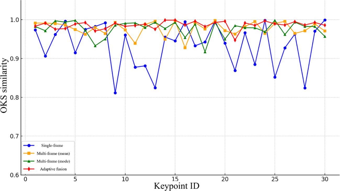 To gain deeper insight into the stability of different localization methods across individual keypoints, Figure 16 presents point-level evaluation results derived from the OKS (Object Keypoint Similarity) metric. As illustrated, the proposed adaptive fusion strategy consistently maintains high OKS values across the majority of picking points, underscoring its superior localization accuracy and robustness. In contrast, the single-frame depth estimation approach exhibits pronounced error fluctuations across multiple positions, indicating limited consistency. Although fusion-based methods (mean and median) perform better overall than single-frame estimation, they still exhibit localized accuracy degradation. These findings further confirm the effectiveness of the OKS metric in evaluating 3D localization precision and reinforce the advantages of the proposed adaptive fusion approach.