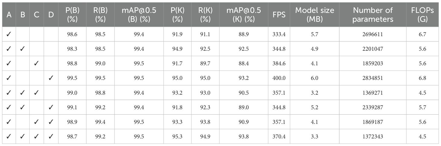 The results indicate that, while maintaining object detection mean average precision (mAP@0.5(B)) consistently within the 98%–99% range, the model achieved a substantial improvement in keypoint detection mean average precision (mAP@0.5(K)), accompanied by a marked reduction in parameter count and computational complexity, thereby achieving an excellent balance between accuracy and efficiency.