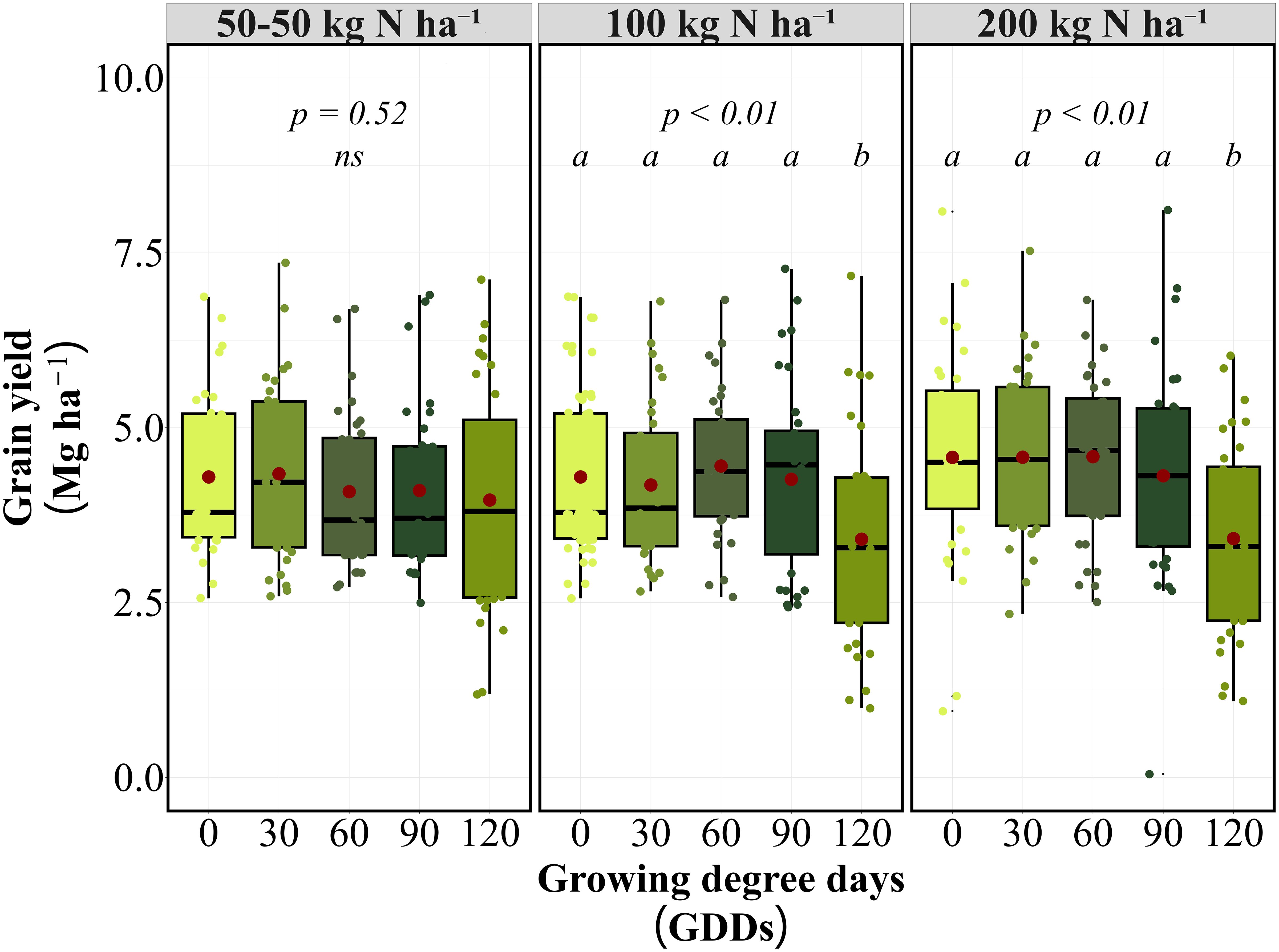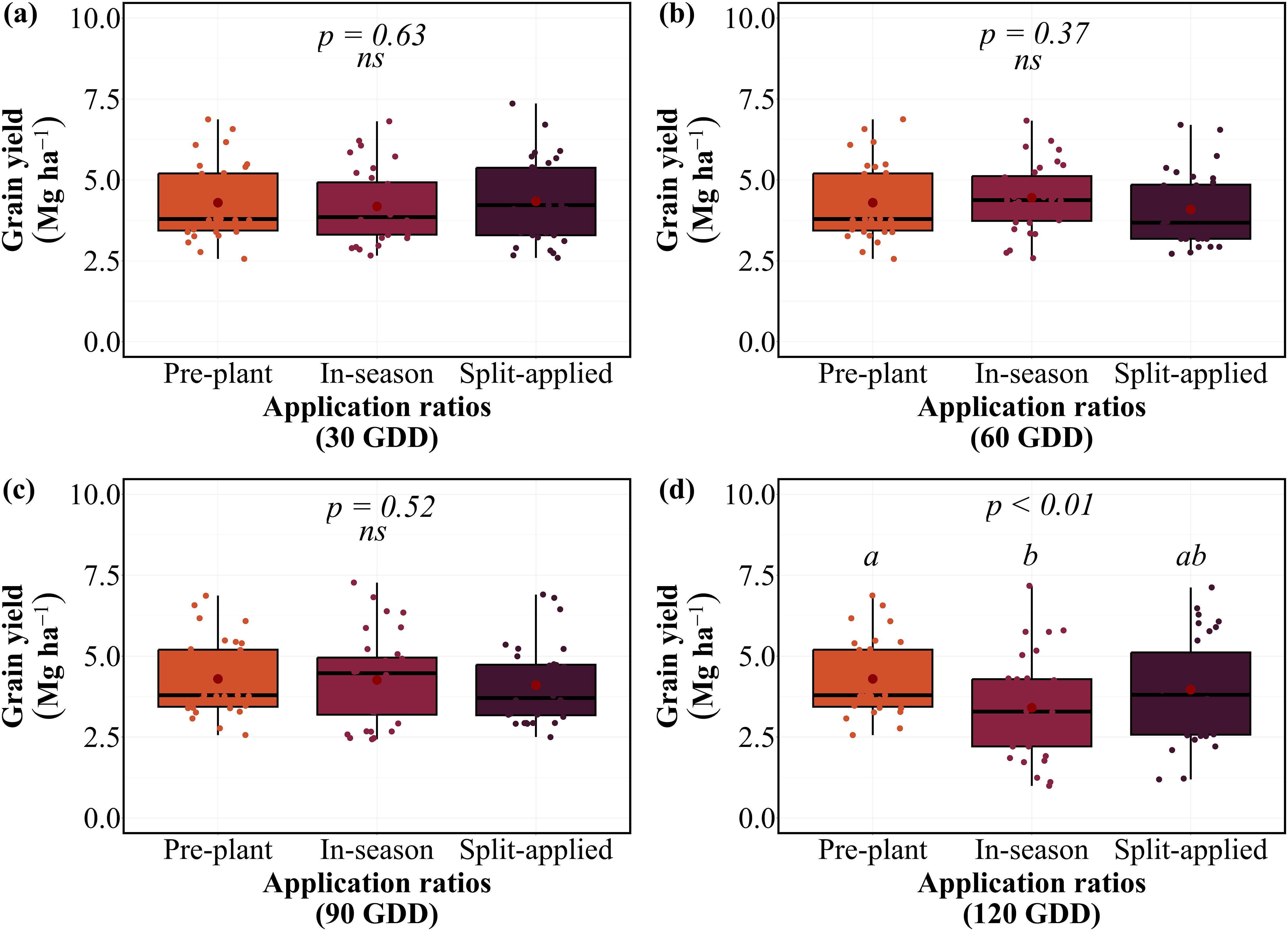 Figure 3. Grain yield response to N application at different GDD timings on average of eight site-years. Box plots show median, quartiles, and range of grain yield values for pre-plant, in-season, and split-applied treatments at (a) 30 GDD, (b) 60 GDD, (c) 90 GDD, and (d) 120 GDD. Red points indicate treatment means. Letters indicate significant differences among application within each timing (p < 0.01); ns indicates non-significant differences.