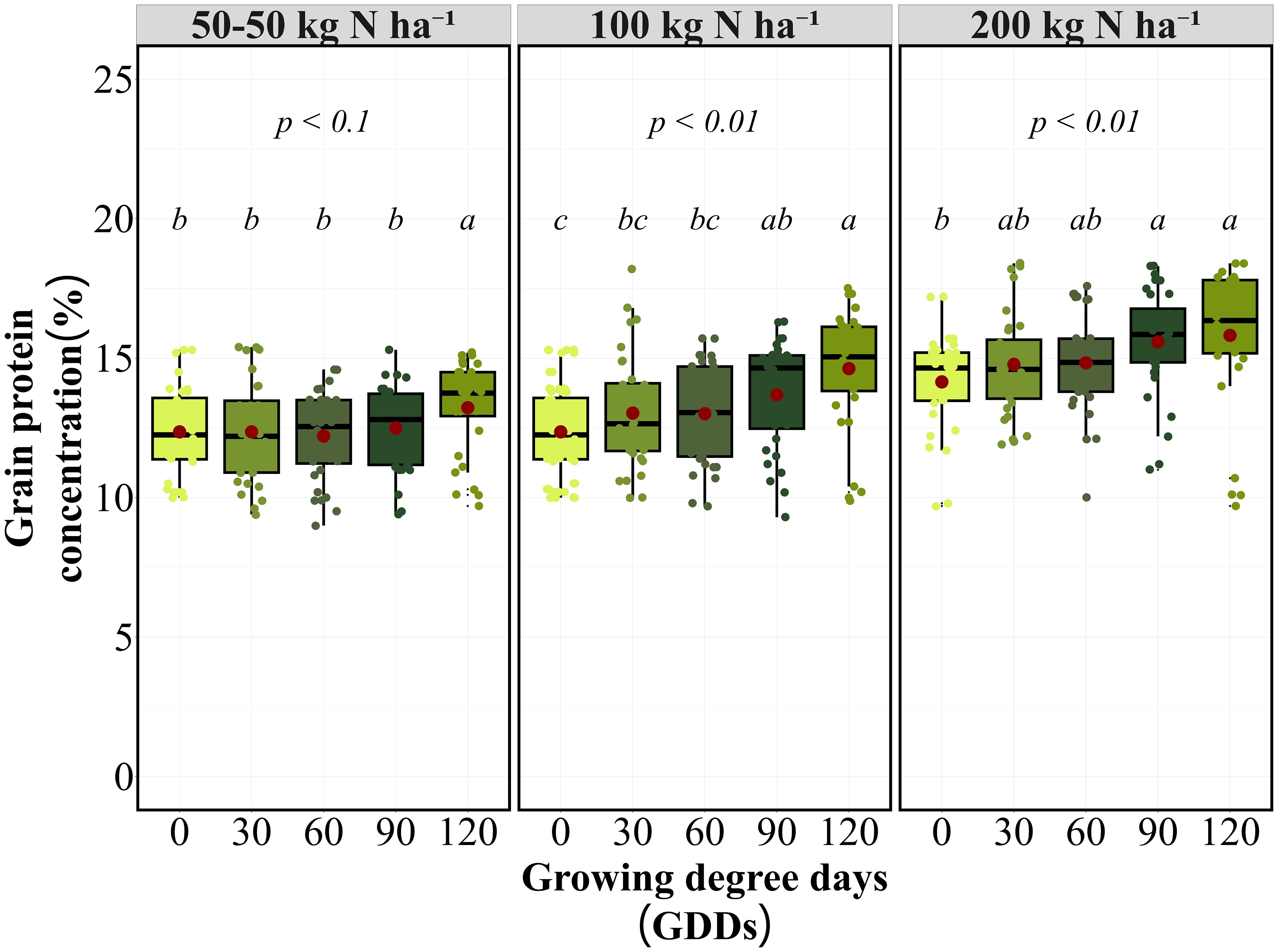 Figure 2. Grain protein concentration (%) response to N application timing at 100 and 200 kg N ha⁻¹ rates on average of eight site-years. Box plots show median, quartiles, and range of GPC values at different growing degree day (GDD) application timings. Red points indicate treatment means. Letters indicate significant differences among timing treatments within each N rate (p < 0.01).