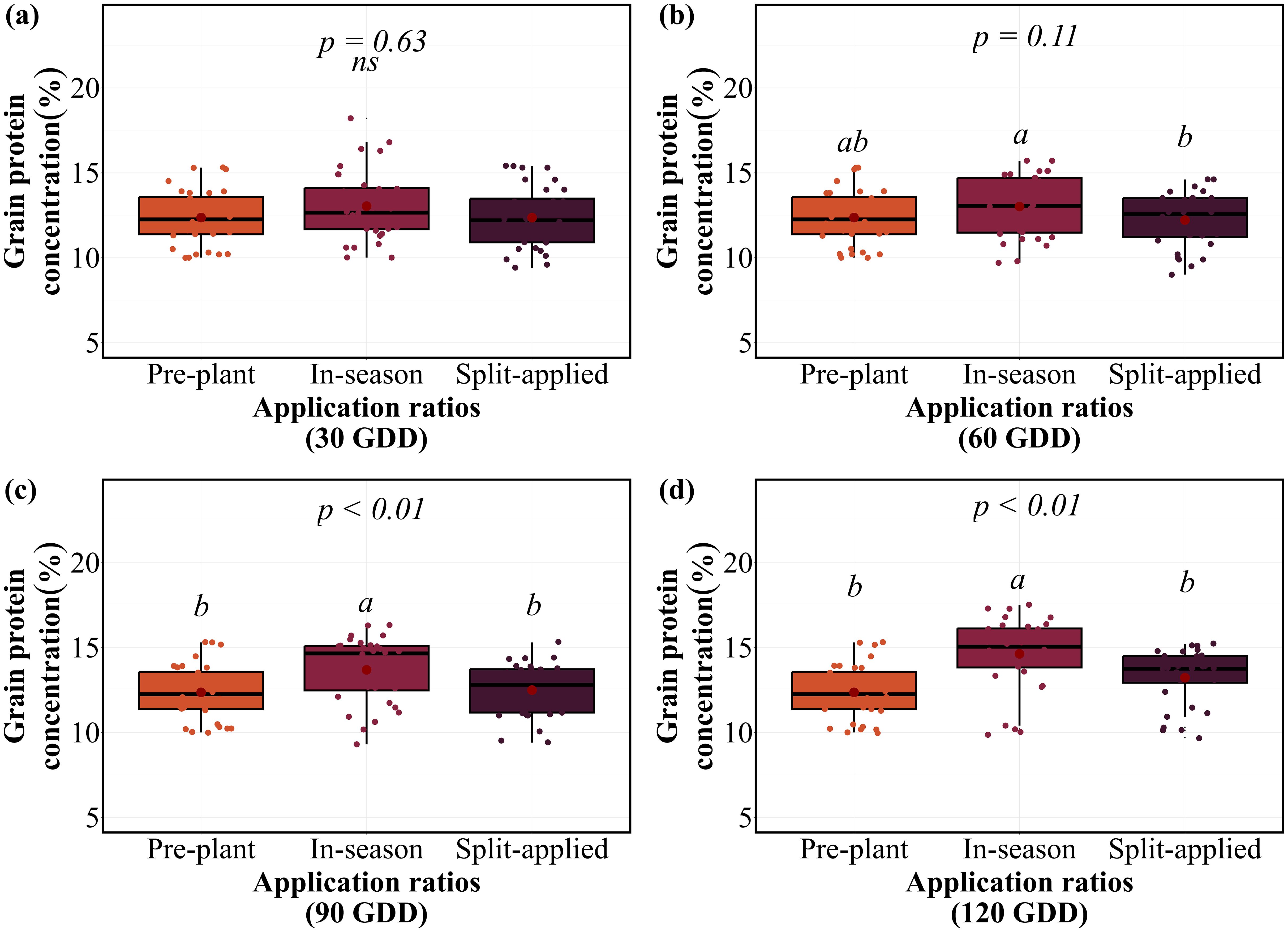 Figure 4. Grain protein concentration response to N application at different GDD timings on average of eight site-years. Box plots show median, quartiles, and range of grain yield values for pre-plant, in-season, and split-applied treatments at (a) 30 GDD, (b) 60 GDD, (c) 90 GDD, and (d) 120 GDD. Red points indicate treatment means. Letters indicate significant differences among applications within each timing (p < 0.01); ns indicates non-significant differences.