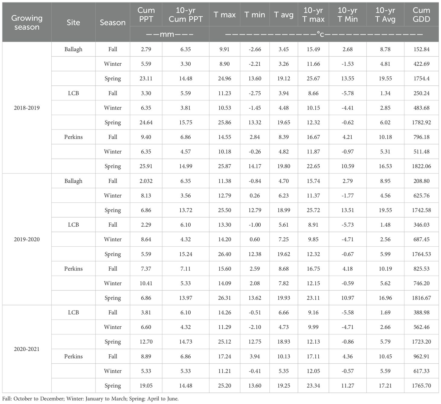 A non-irrigated research study was conducted across three sites in Oklahoma from 2018 to 2021. Specifically, experiments were conducted at three sites during the 2018–2019 and 2019–2020 seasons, with two sites utilized for the 2020–2021 season. Research sites included the Ballagh family research farm (36°52’N, 97°03’W, Newkirk), Oklahoma Research Stations at Lake Carl Blackwell (LCB) (36°09’N, 97°14’W), and Perkins (35°59’N, 97°02’W). All experimental sites were managed under no-till practices. The soil type at Ballagh was Agra-Foraker soil (Fine, mixed, superactive, thermic Udertic Paleustolls). At LCB, the soil was Pulaski soil (Coarse-loamy, mixed, superactive, nonacid, thermic Udic Ustifluvents), and in Perkins was Teller series (fine loamy, mixed, active, thermic Udic Argiustolls) and Konawa series (fine loamy, mixed, active, thermic Ultic Haplustalfs) (USDA/NRCS soil taxonomy). Weather information was acquired daily from planting to harvest (i.e., from October to June) from automated weather stations operated by the Mesonet Oklahoma weather network (McPherson et al., 2007), located proximately to the research sites (Table 1).