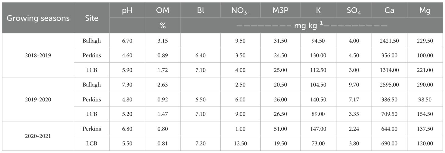 Table 2. Soil fertility information at sowing (0–15 depth) showing soil pH, organic matter (OM), buffer index (BI), nitrate nitrogen (NO3), Mehlich-3 extractable phosphorus (M3P), potassium (K), sulfate (SO4), calcium (Ca), and magnesium (Mg) across three sites (Ballagh, LCB, and Perkins) during 2018-2019, 2019-2020, and 2020–2021 growing seasons.