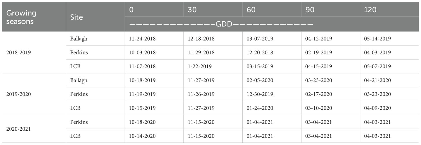Table 3. Planting and nitrogen application dates based on growing degree days (GDD ≥ 0) at 0, 30, 60, 90, and 120 GDD across three sites (Ballagh, LCB, and Perkins) during 2018-2019, 2019-2020, and 2020–2021 growing seasons.