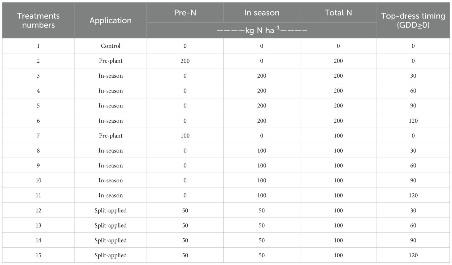 The experiment was arranged in a randomized complete block design (RCBD) with 15 treatments and four replications. Individual plots measured 3.1 m × 6.1 m, with alleys of 3.1 m between plots, resulting in a total trial area of 34 m × 49 m. Top-dress N applications were made at different growing degree days (GDD > 0) timings: 30, 60, 90, or 120 GDD. The treatment consisted of various combinations of N application rates and timings (Table 3). Three applications included Pre-plant N, in-season N, and split application at different N rates of 0, 50, 100, or 200 kg N ha⁻¹ (Table 4). For each experimental plot, 50 kg N ha⁻¹ of ammonium nitrate was applied at the specified GDD timings. This design enabled direct comparison of split versus single applications while identifying optimal timing across sub-optimum and excessive N rates.Growing degree day calculation and rationale.