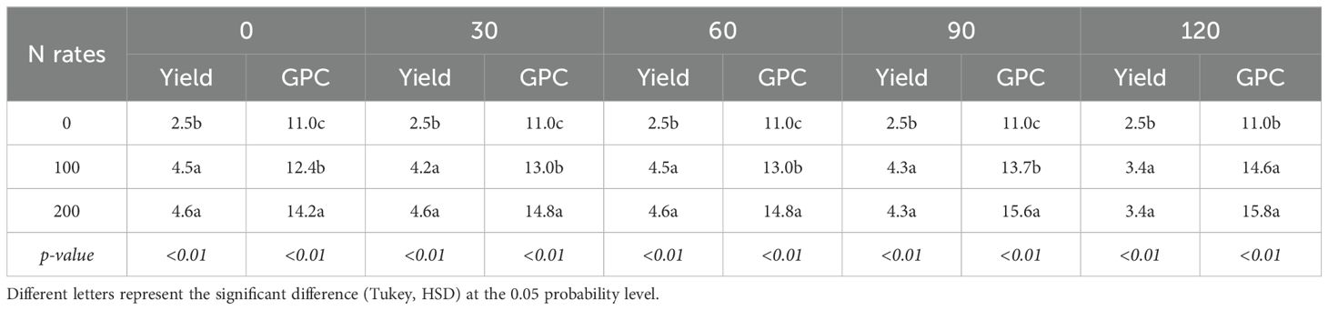 However, GPC responses revealed parameter-specific predictive limitations. While timing response patterns remained identical between rates, absolute GPC values diverged significantly. GPC increased from 12.4% to 14.2% when comparing 100 to 200 kg N ha⁻¹ at planting (0 GDD) (Table 5). Both rates achieved maximum GPC at 120 GDD (14.6% vs. 15.8% for 100 vs. 200 kg N ha⁻¹, respectively), demonstrating parallel response curves despite the absolute value differences.