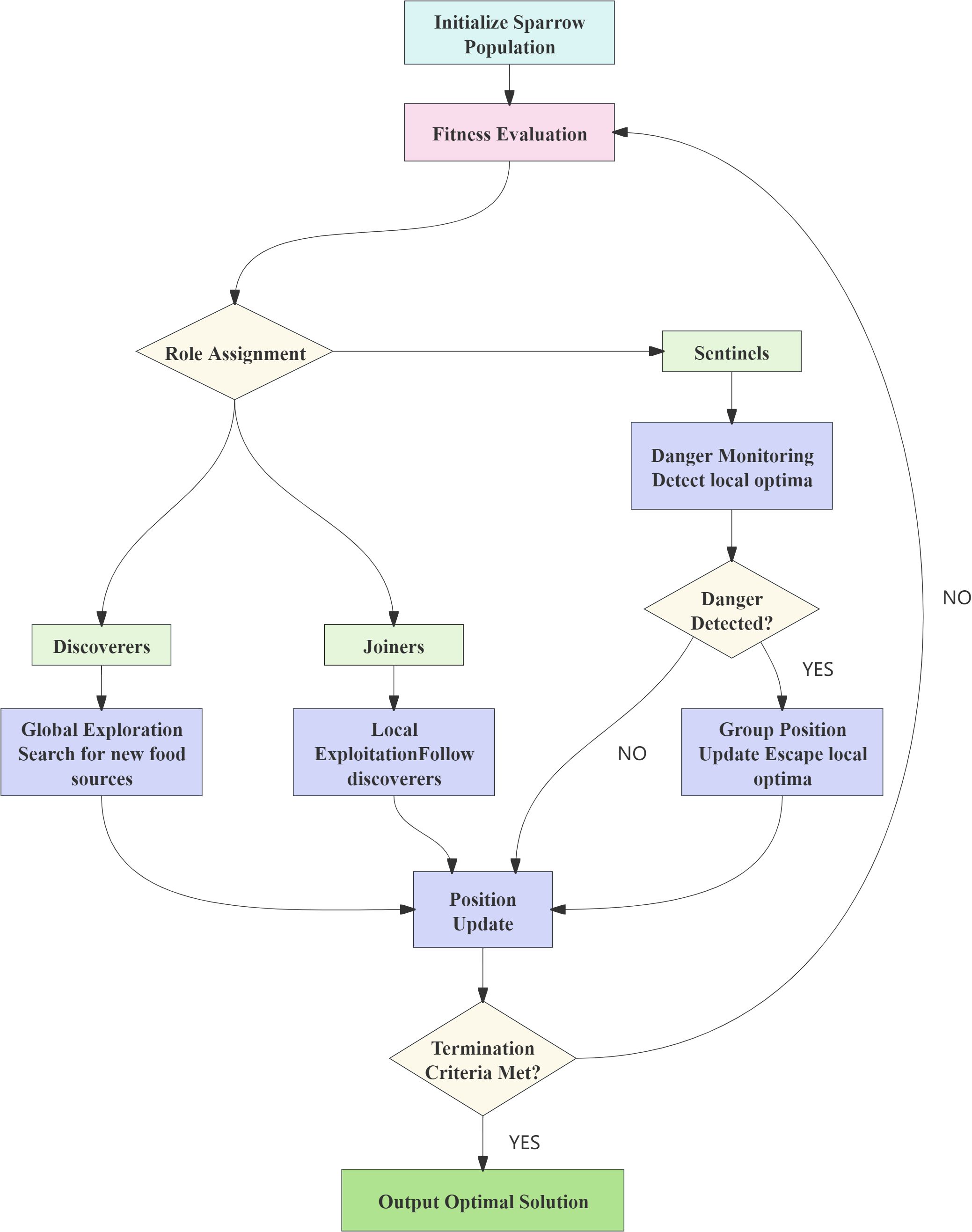 Flowchart illustrating the sparrow search algorithm. It starts with initializing the sparrow population, followed by fitness evaluation. Roles are assigned as discoverers or joiners. Discoverers perform global exploration for new food sources, while joiners follow them for local exploitation. Sentinels monitor danger, detecting local optima. If danger is detected, a group position update occurs to escape local optima. The position is updated, and if termination criteria are met, the optimal solution is output. If not, the process reiterates.