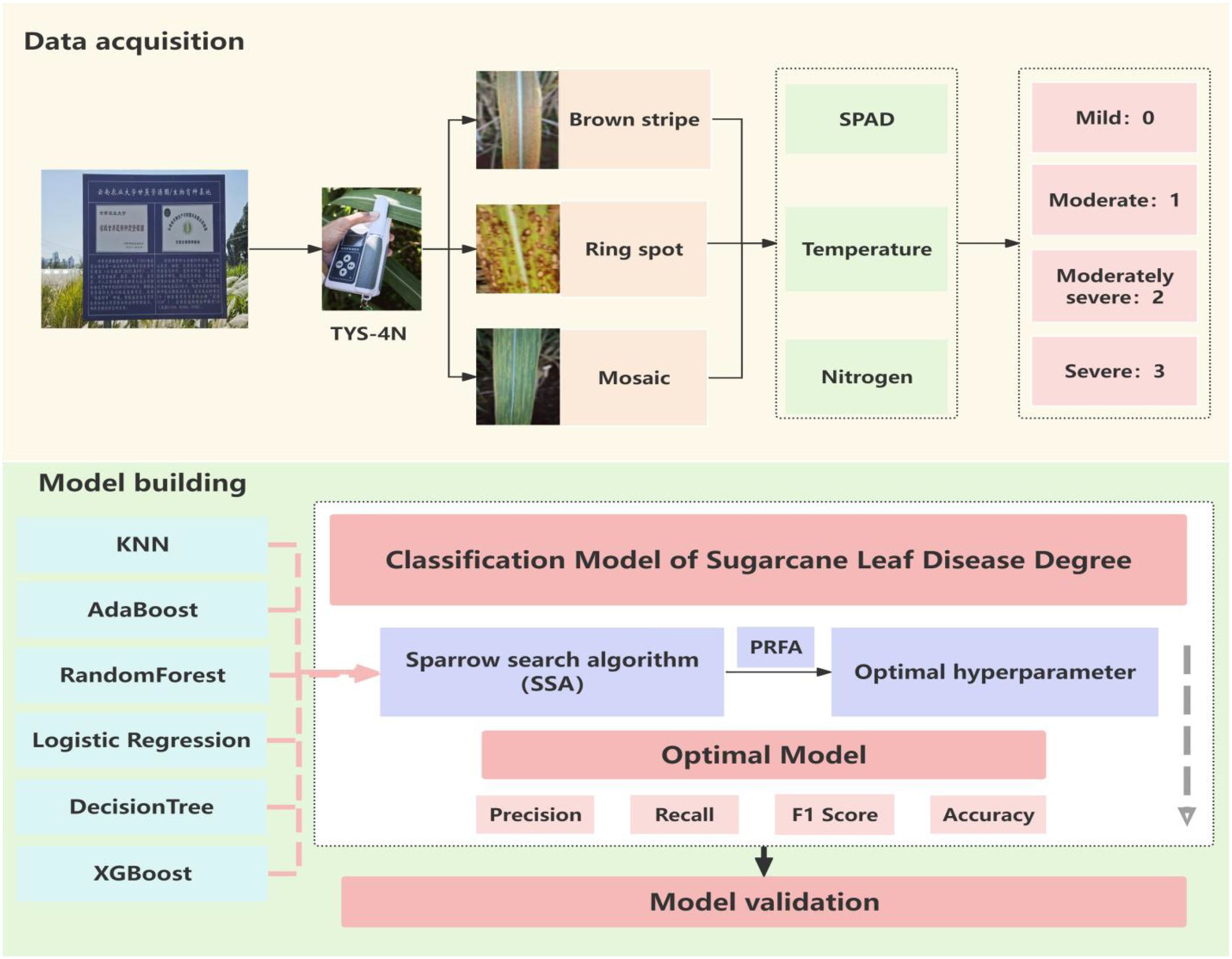Flowchart illustrating the process of classifying sugarcane leaf disease severity. It includes data acquisition using TYS-4N device, observing symptoms like brown stripe, ring spot, and mosaic with factors such as SPAD, temperature, and nitrogen levels. Severity is classified from mild (0) to severe (3). The model building section employs algorithms like KNN, AdaBoost, and others, optimized by the sparrow search algorithm and PRFA, to develop the classification model validated by precision, recall, F1 score, and accuracy.
