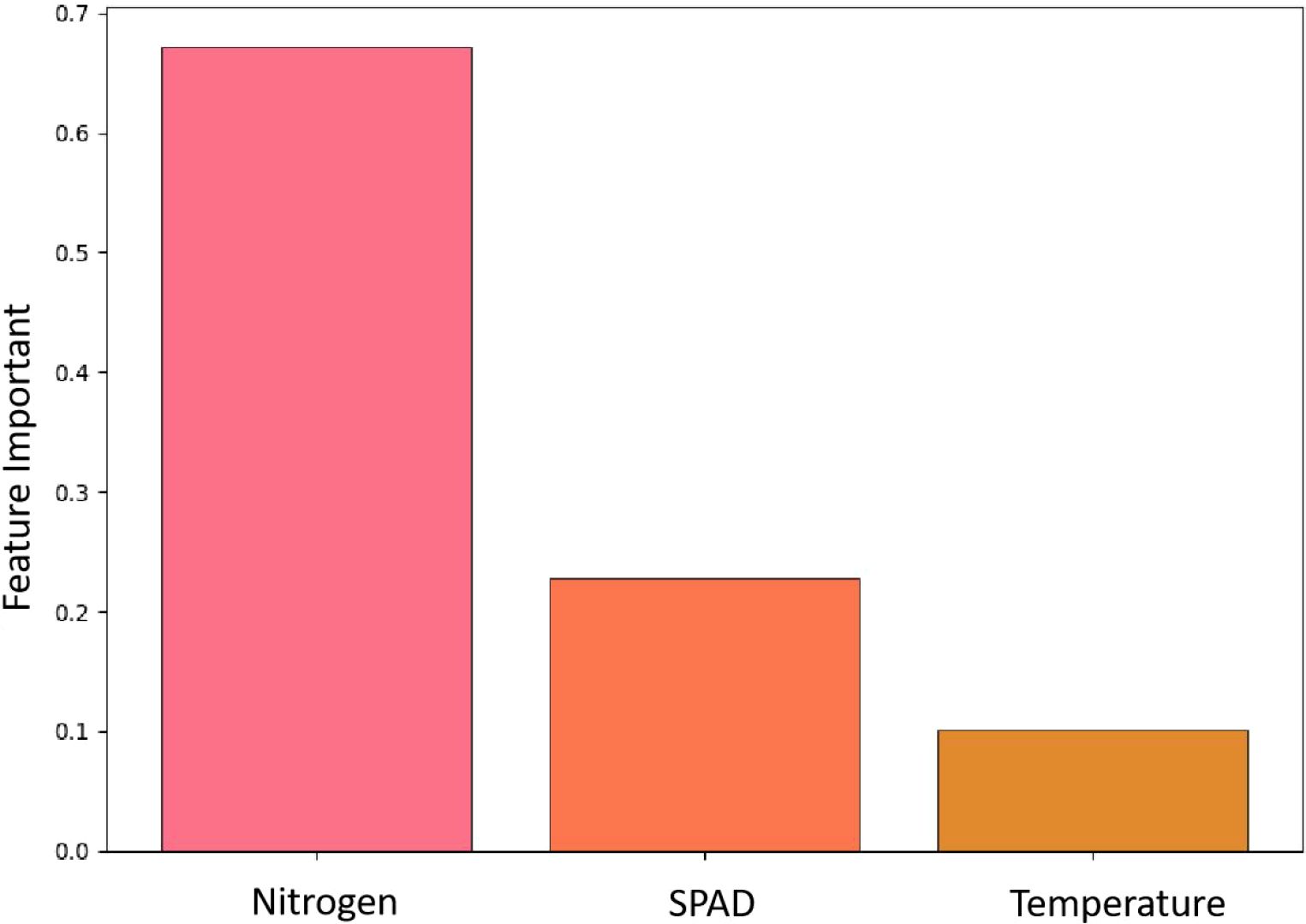 Bar chart titled “Feature Importance” comparing the significance of three features: Nitrogen, SPAD, and Temperature. Nitrogen is the most important, followed by SPAD and then Temperature.