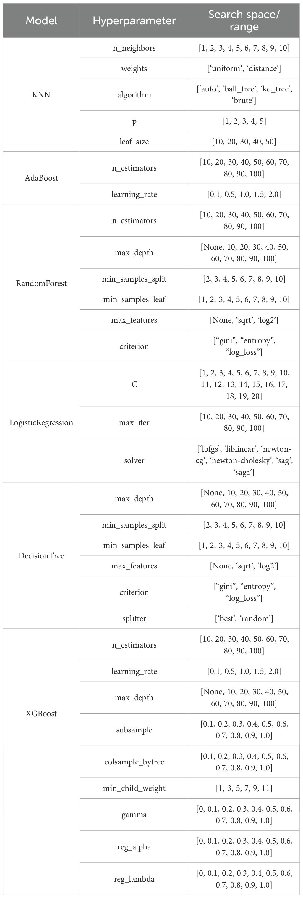 Selected hyperparameters and their corresponding search ranges are listed in Table 2. A fixed random seed (random_state=42) was used for reproducibility, while remaining hyperparameters were set to default values. All hyperparameters were encoded (either continuously or discretely) into the SSA search vector, with boundary constraints and type validation enforced during optimization. Ultimately, the optimal hyperparameter combination yielding the highest PRFA score is selected for each model and used in subsequent performance evaluation on the independent test set.