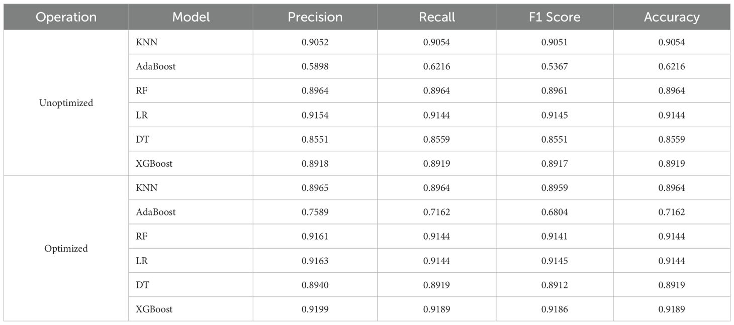 SSA significantly improved the performance of all models by optimizing key hyperparameters to maximize PRFA on a validation subset. After optimization: XGBoost emerged as the top performer, achieving Precision=0.9199, Recall=0.9189, F1-score=0.9186, Accuracy=0.9189, surpassing even the unoptimized LR model. Improvements ranged from +0.027 to +0.028 across metrics, demonstrating SSA’s effectiveness in fine-tuning ensemble models. AdaBoost showed the most dramatic improvement: F1-score increased by 0.1043, with all metrics converging toward 0.67–0.69, indicating enhanced stability and reduced bias due to better parameter configuration. KNN, RF, LR, and DT also improved by 0.01–0.03 on average, confirming the broad applicability of SSA in enhancing model robustness.