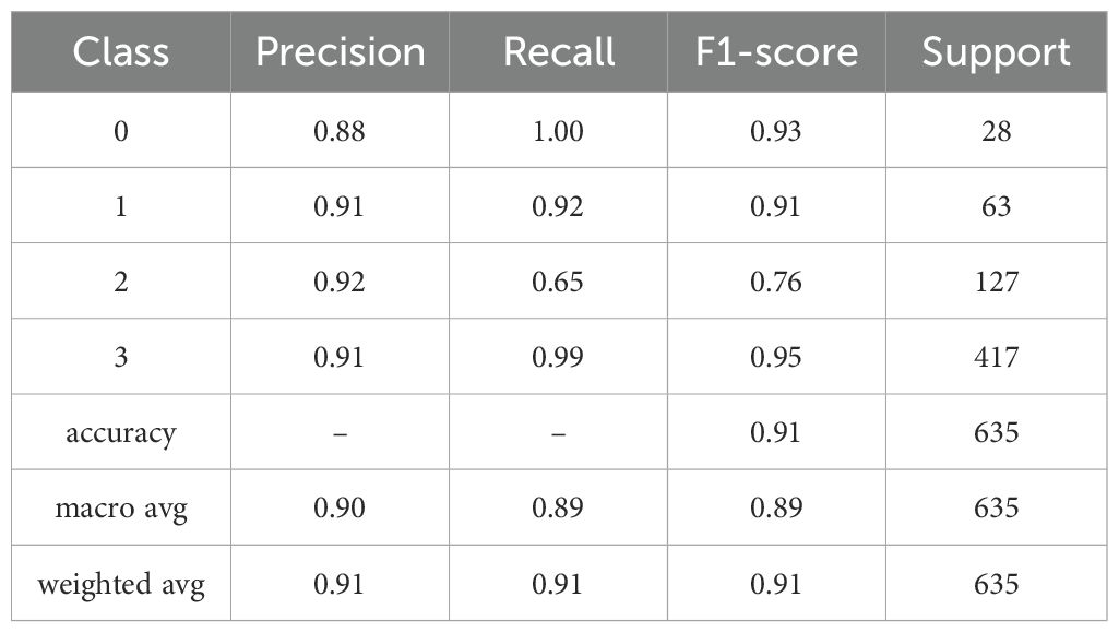 As shown in Table 7, the model achieved an overall Accuracy of 0.91, with a weighted F1-score of 0.91 and a macro F1-score of 0.89, indicating strong generalization. Specifically: Precision was highest for Level 2 (0.92) and lowest for Level 0 (0.88), suggesting high specificity for moderately severe cases. Recall was perfect for Level 0 (1.00), indicating no missed detection of healthy/lightly diseased plants, but lowest for Level 2 (0.65), revealing misclassification or under-detection. F1-score was highest for Level 3 (0.95) and lowest for Level 2 (0.76), highlighting classification ambiguity in the moderately severe category.