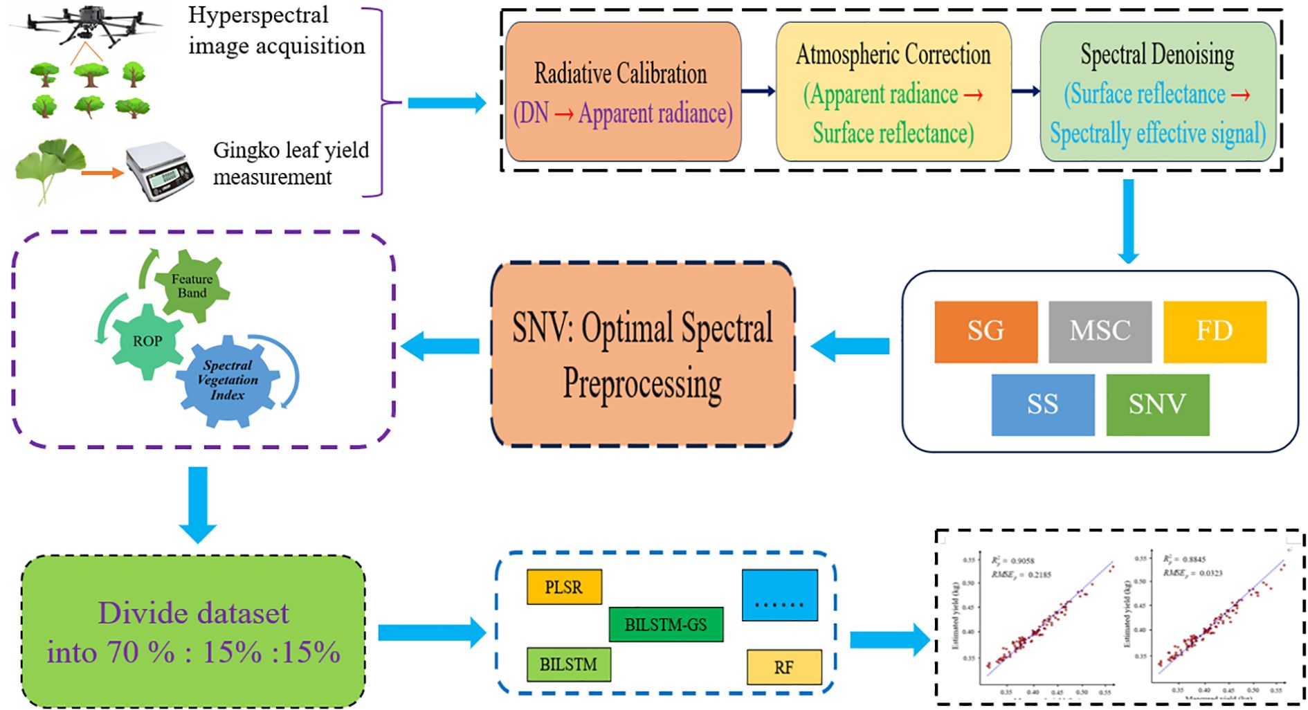 This study systematically developed and validated a hyperspectral inversion model for ginkgo leaf yield prediction by integrating advanced preprocessing, feature selection, and machine learning techniques. The optimal SNV- (SAVI - MSAVI – NDRE - SIPI - ROP) - (BiLSTM-GS) model achieved superior performance ( = 0.8795), demonstrating the significant potential of airborne hyperspectral imaging for non-destructive yield assessment in economic forestry.