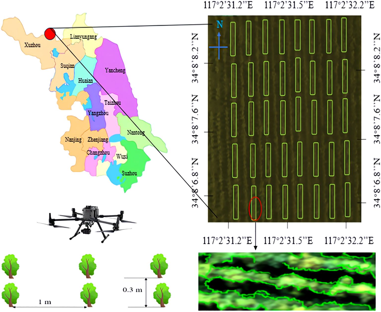 Hyperspectral remote sensing images of Ginkgo biloba canopy were acquired for yield acquisition. The experimental site was Xuzhou Changrong Agricultural Development Co., Ltd. (34°8 ‘ 42’N, 117°2 ‘45’E). A total of 10,000 Ginkgo biloba trees were planted in the scientific research base, covering a plot size of 0.8 × 4 m2. The experimental involved three-year-old ginkgo trees cultivated at the scientific research base. The trees were spaced 1 m between rows and 0.3 m between plants. Figure 2 shows the geographical location of the experimental site and the contour characteristics of the ginkgo tree canopy.