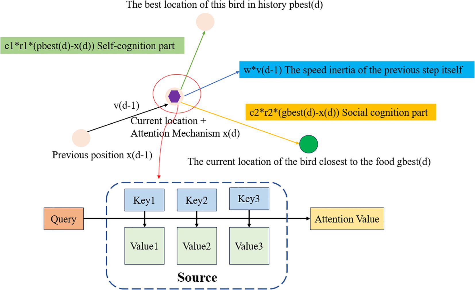 PSAMA mainly introduces the Attention Mechanism into the PSO algorithm, which dynamically adjusts the attention degree of information by adjusting the position of particles. The core idea is to calculate the weight coefficient of each key ‘s corresponding value (Value) according to the correlation between Query and Key, and then obtain the final output by weighted summation, that is, the final Attention values. In essence, the Attention mechanism is the weighted summation of the Value values of the elements in the Source, and Query and Key are used to calculate the weight coefficient of the corresponding value (Lang et al., 2024). Its working principle is shown in Figure 3 and Equation 4.