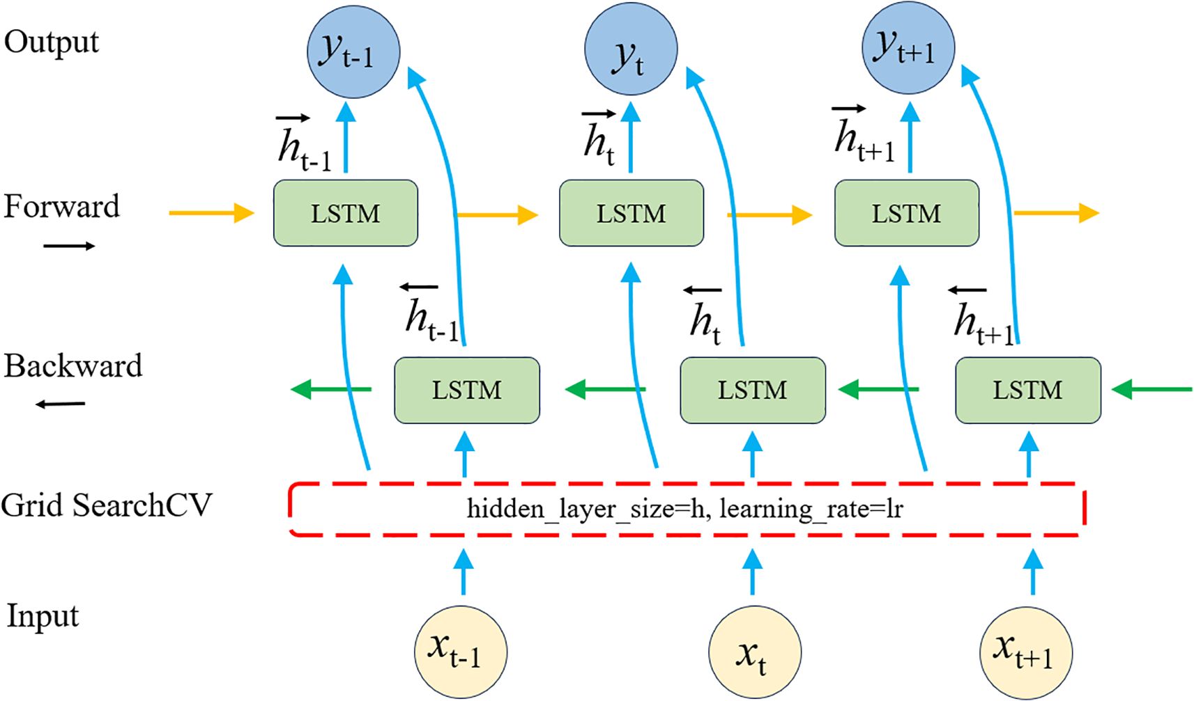 The BiLSTM-GS model integrates the BiLSTM architecture with the GridSearchCV algorithm (Liang et al., 2024). While the standard BiLSTM model only tunes the learning rate, BiLSTM-GS introduces an additional hyperparameter—hidden layer size—to achieve more comprehensive optimization. As an enhanced LSTM variant, BiLSTM processes sequences bidirectionally (forward and backward), enabling more effective capture of contextual dependencies (Zhang et al., 2025). GridSearchCV automates hyperparameter selection through systematic cross-validation, significantly improving model performance. The architecture of the BiLSTM-GS model is illustrated in Figure 4.