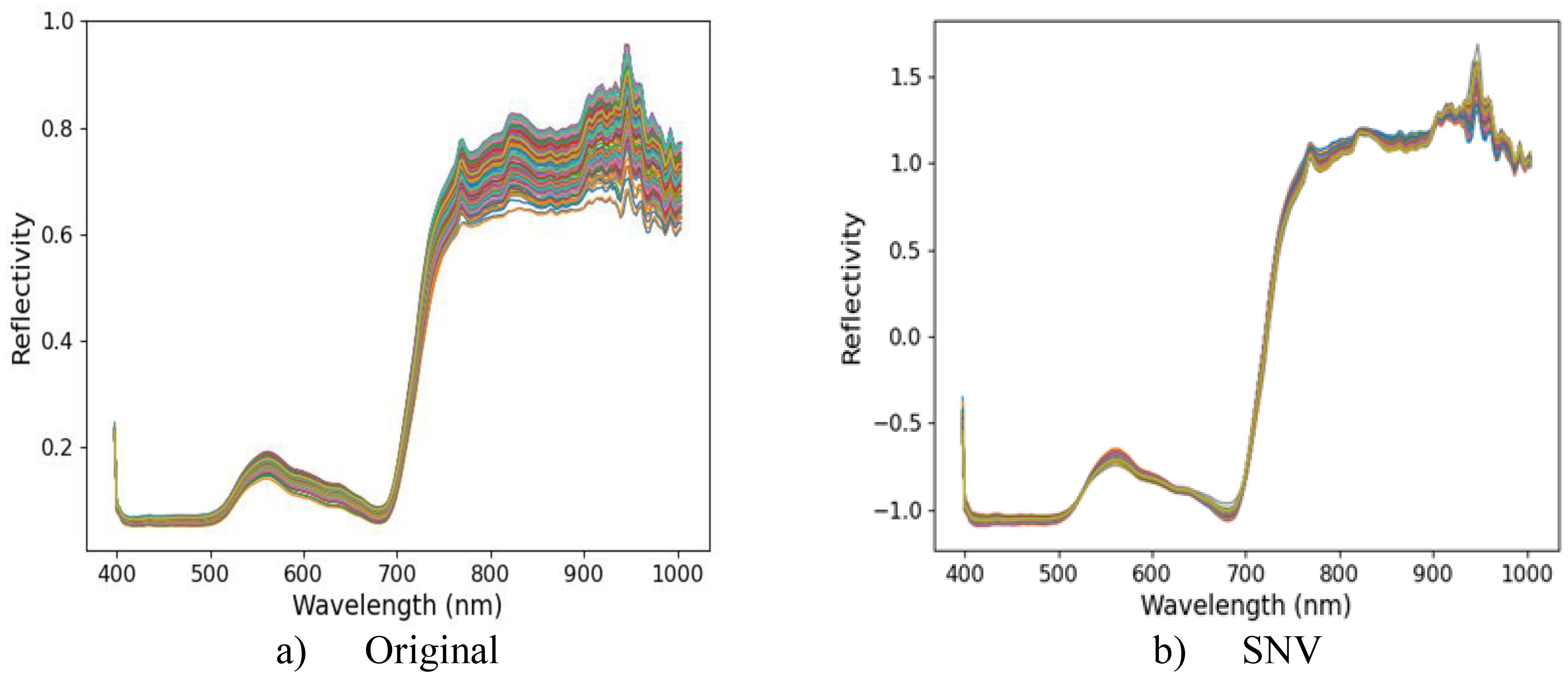 Hyperspectral images are often influenced by environmental and instrumental factors such as temperature, humidity, light intensity, and illumination angle, which can introduce noise into the data. To improve data quality, a series of preprocessing steps were applied, including Multiplicative Scatter Correction (MSC) (Xu et al., 2024), Savitzky–Golay smoothing (SG) (Bing et al., 2018), Standard Normal Variate (SNV) (Jong et al., 2024), First Derivative (FD) (Xunlan et al., 2023), and Standard Scaling (SS) (Faehn et al., 2024).