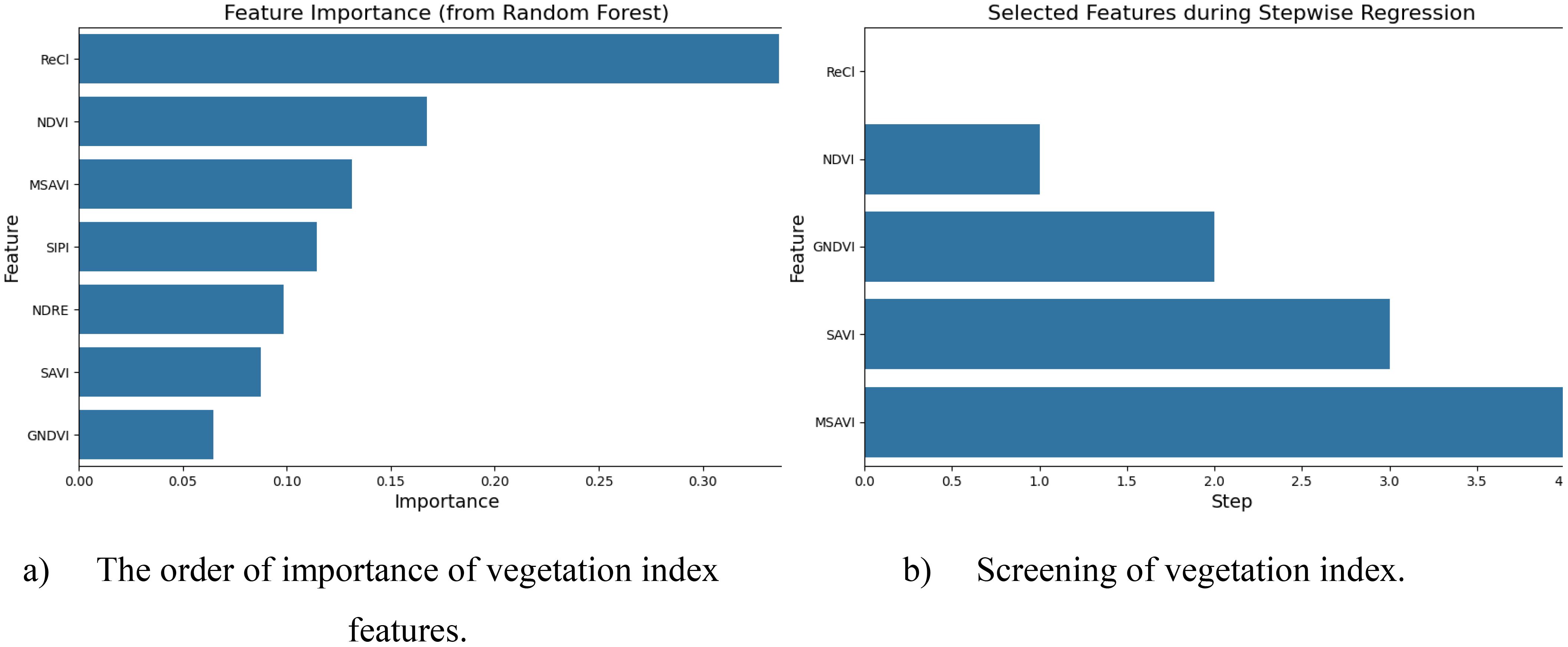 Figure 6. (a) shows the vegetation indices screened based on importance ranking, and (b) shows the reasonable vegetation indices selected by the stepwise regression method.