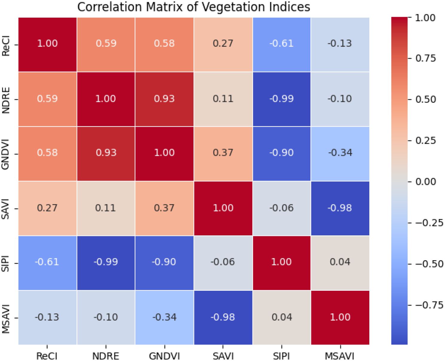 The correlation analysis results of Figure 7 show that GNDVI and NDRE were highly positively correlated (r = 0.93), indicating that they have similar spectral response characteristics and can be used interchangeably to reduce data redundancy. However, GNDVI and SIPI (r = -0.90), SAVI and MSAVI (r = -0.98), and SIPI and NDRE (r = -0.99) showed significant negative correlations. These index combinations may represent different vegetation physiological characteristics or environmental stress responses. Therefore, SAVI, MSAVI, NDRE and SIPI were finally selected as the representative vegetation index combination, which can not only fully reflect the vegetation status, but also effectively avoid information redundancy.