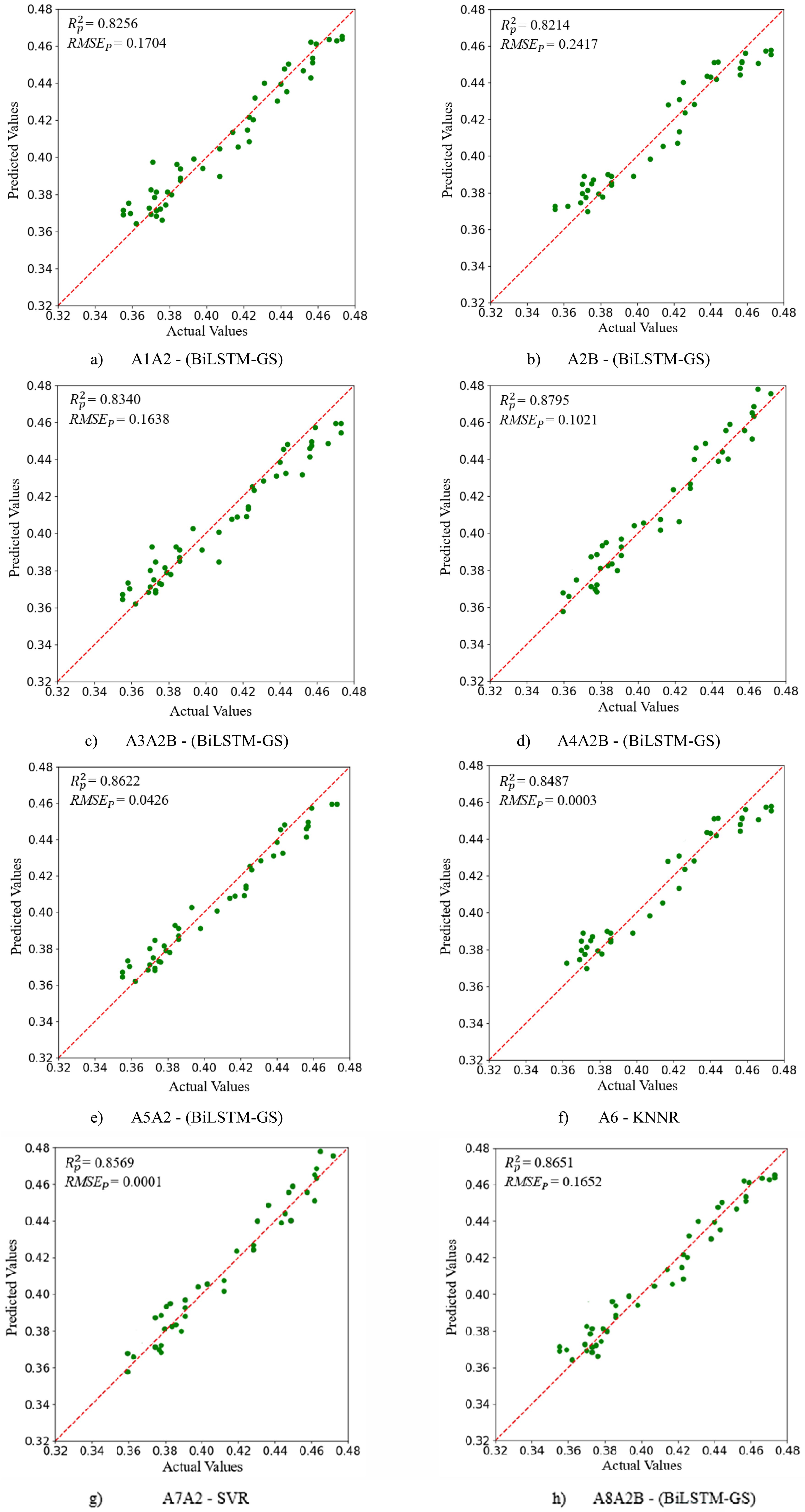 As shown in Table 4, when A4A2B was used as the input variable, the BiLSTM-GS model achieved the highest prediction accuracy ( = 0. 8795, = 0.1021). To visually illustrate the optimal prediction yield models corresponding to the combination of A1 ~ A8 bands and spectral vegetation indices, eight regression diagrams were used, as shown in Figure 8.