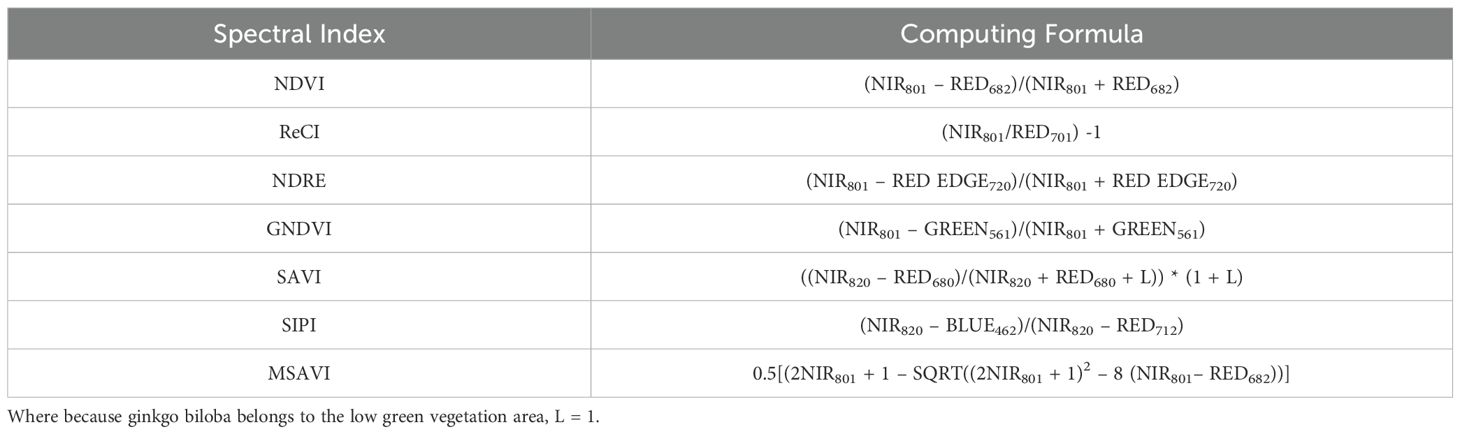 Among the alternative spectral indices, those with a high correlation to ginkgo leaves and a weak intercorrelation were selected. Based on the spectral indices used in relevant references, seven commonly used spectral indices are chosen as alternative indices, and their respective calculation formulas are shown in Table 1. The Normalized Difference Vegetation Index (NDVI), obtained by the ratio of the near-infrared to the red band, reflects the vegetation coverage and Leaf Area Index (LAI), and is often used to assess the health status and biomass of vegetation (Wang et al., 2024). The Red Edge Chlorophyll Index (ReCI), taking advantage of the sensitivity of the red edge band to chlorophyll content, directly reflects the chlorophyll concentration in leaves (Xueyu et al., 2021). The NDRE, calculated as the ratio of the near-infrared to the red edge band, is more sensitive to changes in chlorophyll content, especially in the later stages of vegetation growth. The Green Normalized Difference Vegetation Index (GNDVI), which replaces the red band with the green band, is more sensitive to changes in chlorophyll content (Ge et al., 2019). The SAVI, by introducing a soil adjustment factor, reduces the influence of the soil background on the vegetation index and more accurately reflects the vegetation coverage (Tooley et al., 2024). The SIPI is insensitive to changes in leaf structure and mainly reflects the ratio of carotenoids to chlorophyll (Srivastava et al., 2020). The MSAVI further optimizes the impact of the soil background and is applicable to areas with low vegetation coverage (Shezhou et al., 2015). These seven spectral indices have a high correlation in the prediction of ginkgo leaf yield and a relatively weak correlation with each other. By covering key factors such as leaf area and chlorophyll content, they can effectively evaluate the health status, photosynthetic efficiency, and biomass of ginkgo leaves, providing a scientific basis for yield prediction.