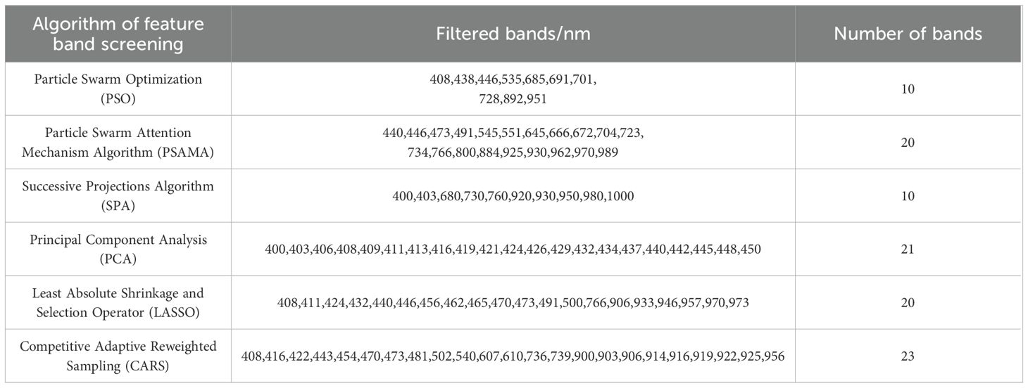 In this study, a variety of feature band screening methods were used to analyze the spectral data preprocessed by SNV. Among them PSO, SPA, PSAMA, LASSO and CARS were used to filter the characteristic bands (10,10,20,20 and 23, respectively), which were evenly distributed in the range of 400 ~ 1000 nm, effectively reducing redundant information and retaining the most representative spectral features. In contrast, the 21 characteristic bands screened by PCA were mainly concentrated in the short-wave region of 400 ~ 450 nm, showing unique wavelength selection characteristics. The results are shown in Table 3. Different feature selection methods have both commonalities in band distribution (most methods select wide spectral range features) and their own characteristics (PCA focusing on shortwave regions), which provides a variety of feature selection schemes for subsequent spectral analysis.