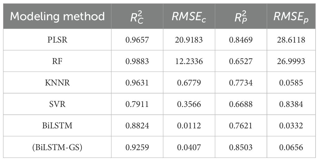 Results: Results demonstrated that the SNV-PLSR model achieved superior performance ( = 0.7831, = 0.0325). The optimal SNV- (SAVI - MSAVI - NDRE - SIPI - ROP) - (BiLSTM-GS) model, combining PSAMA-selected feature bands with vegetation index and ROP, yielded outstanding prediction accuracy ( = 0.8795, = 0.1021).