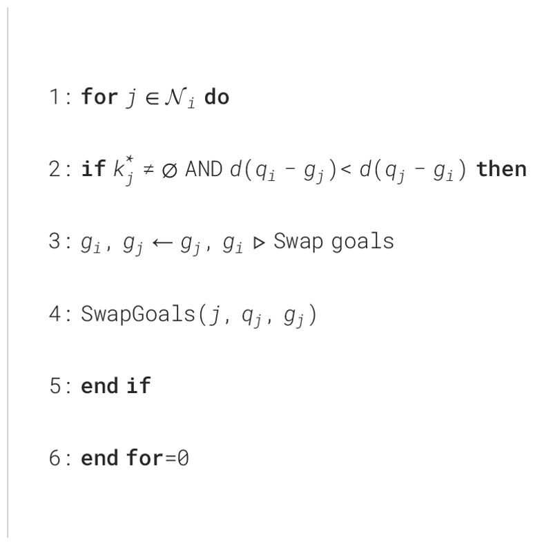 Since actions sampled from the TS algorithm can be anywhere in the environment, it is possible that robots may select points in inefficient ways, e.g., two robots swapping places. To remedy this, we propose a goal reassignment strategy in which robots swap goals with a neighbor if both robots are in the idle state and if the swap will decrease the total distance traveled by the team, i.e., . Once a goal swap occurs, the swapped robot continues to check the necessity of goal swapping in its neighborhood, as outlined in Algorithm 3. As a result of this, the distance between a robot and an assigned goal is always closer than the other pairs.
