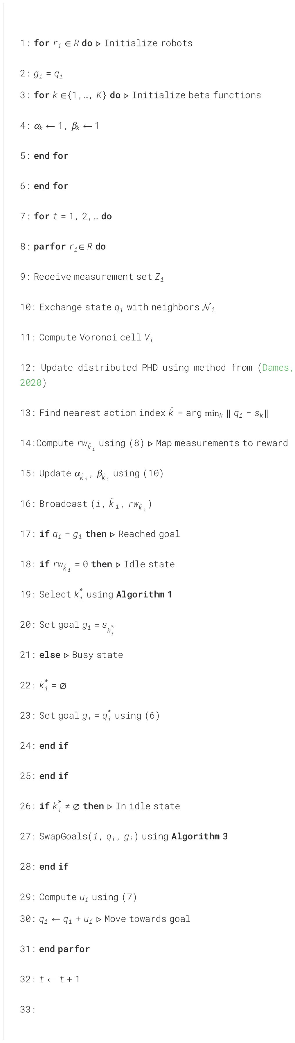 Algorithm 2 outlines our strategy, where is the goal for robot and are the neighbors of robot in the communication graph, i.e., the set of robots that it can directly communicate with. The “ParFor” block indicates that all robots execute their internal logic concurrently and asynchronously. All robots are initialized with their goal as the current location and with (lines 1-6). As robots explore, they receive measurements. At each time step, robots must exchange states with their neighbors in order to compute Voronoi cells and update the distributed PHD (lines 9-12). Robot also use the measurements to update the beta distribution parameters for the nearest action point and broadcasts this information to all neighbors in the communication graph to ensure that all robots have identical information (lines 13-16). Once a robot reaches its goal, each robot will then enter either the idle or busy state, depending on the reward received, and select its next goal. In the idle state a robot uses the TS algorithm from Sec. 2.2 (lines 19-20), while in the busy state a robot uses Lloyd’s algorithm (6) (lines 22-23). If a robot is in the idle state, it has the option to swap goal with a neighbor in order to decrease the total distance traveled by the team (lines 26-28), the details of which are described in the next subsection. Finally, each robot moves towards it current goal (lines 29-30).
