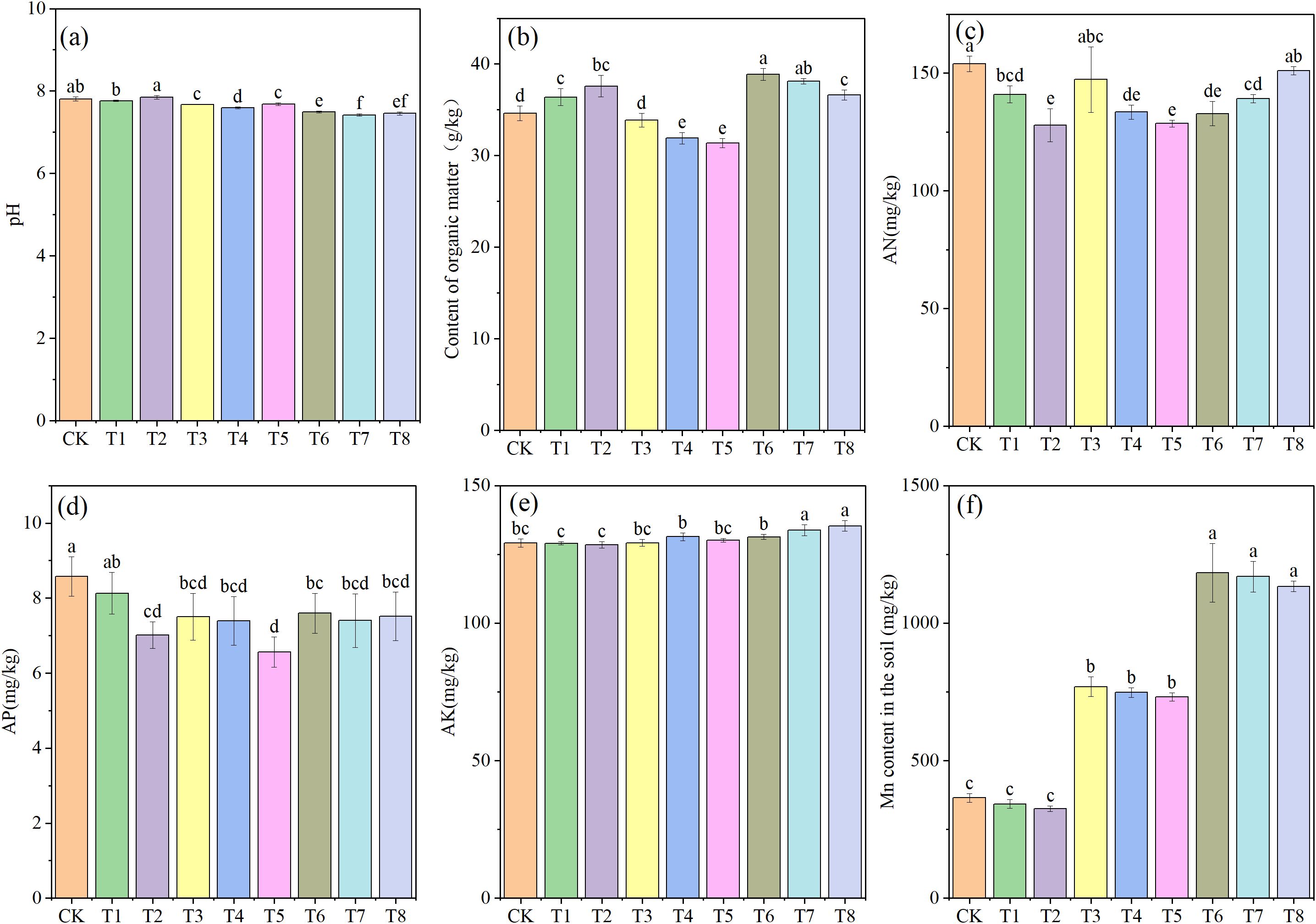 Figure 1 shows the soil nutrient indices across different treatments. The soil pH ranged from 7.42 to 7.85. Compared with the CK, Mn application significantly reduced soil pH (P < 0.05) in the 0.25% and 0.5% treatments. In contrast, the addition of PE-MPs had no noticeable effect on pH. The lowest soil pH was recorded under the combined treatment of 1.5% PE-MPs and 0.50% Mn. Soil OM content also displayed distinct variations, with PE-MPs alone significantly increasing the OM content (P < 0.05). However, in the 0.25% and 0.50% Mn treatments, the addition of PE-MPs significantly reduced the OM content (P < 0.05). Notably, among all treatments, the three with an Mn addition level of 0.25% had the lowest OM content, with decreases of 2.11%, 7.80%, and 9.36% for T3, T4, and T5, respectively. The application of Mn significantly reduced the soil AN content (P < 0.05). The addition of PE-MPs alone also significantly lowered the AN content (P < 0.05), and their co-application with Mn resulted in a more pronounced decrease (P < 0.05), with the lowest AN content observed under the 0.25% Mn + 1.5% PE-MPs treatment. Soil AP ranged from 6.57 to 8.58 mg/kg. Both PE-MPs and Mn individually caused significant reductions in the soil AP content (P < 0.05), and their combined effect further intensified this decrease (P < 0.05). The lowest AP content, representing a 23.42% reduction compared to the CK, occurred with the 0.25% and 1.5% treatments. The soil AK content ranged from 128.48 to 135.37 mg/kg. Both the addition of Mn and PE-MPs increased the AK content in the soil. The highest AK content was observed under the 0.50% and 1.5% treatments, which both produced a significant increase (P < 0.05). Following Mn application, the total soil Mn concentration ranged from 325.11 to 1183.14 mg/kg.