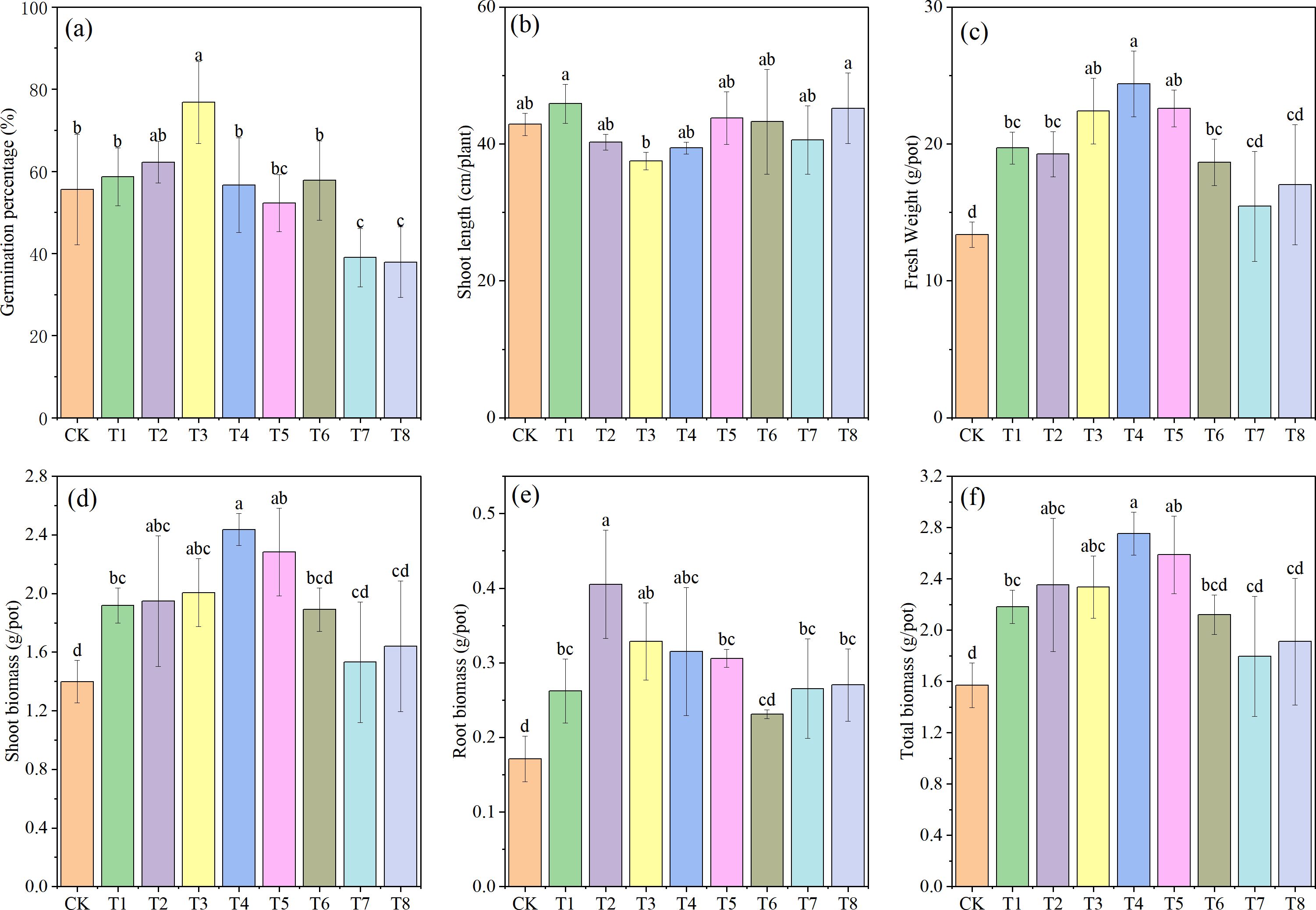 All data was analyzed using Excel. Various parameters, including germination rate, plant height, plant antioxidant enzyme activity, biomass, root morphology, soil nutrient indices, and plant Mn uptake characteristics under different treatments, were calculated and presented as the mean ± standard deviation (SD). Results were visualized as bar charts using Origin 2021. A one-way ANOVA was conducted using IBM SPSS Statistics 26.0 to evaluate differences among treatments. Multiple comparisons were conducted using the Least Significant Difference (LSD) test. Additionally, mantel tests and correlation heatmap analyses were conducted using R4.4.2 software to explore the relationships between variables.