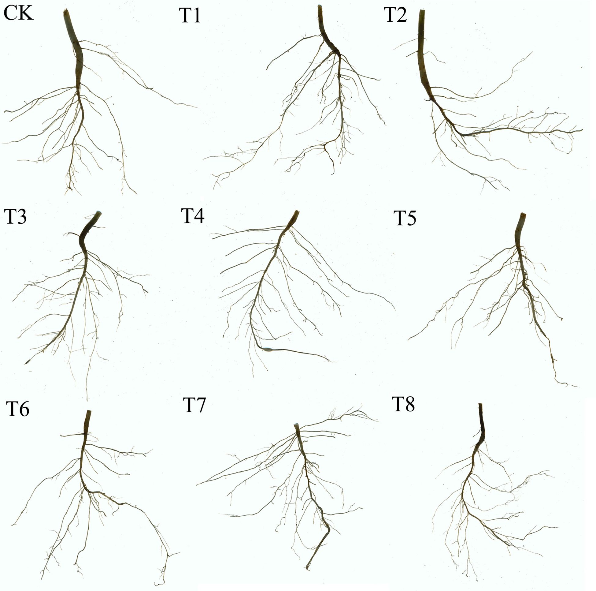 The aboveground parts of all plants in each pot were cut off, then rinsed with tap water, cleaned with deionized water, blotted dry, and their fresh weight was measured using a balance. To assess the growth status of plant root systems, roots were carefully separated to keep them intact. One complete root system was randomly selected from each pot, and loosely attached soil was washed off with tap water, followed by rinsing with distilled water. The cleaned root was placed in a transparent tray with an even layer of distilled water and scanned using a root nodule assessment system (GXY-A1 root analyzer, Top Instrument, Zhejiang, China). The scanned images were analyzed with RootAnalysis Pro software to measure root morphological parameters, including the number of root tips, total length (mm), root diameter (mm), and total surface area. The scanned roots and root systems within the same pot were placed into kraft paper bags. Along with the above-ground parts (after fresh weight had been measured), they were subjected to a 30-minute fixation treatment at 105 °C. Samples were then dried at 65 °C until a constant weight was achieved. The stem, root, and total biomass were recorded. The dried samples were crushed and stored for the determination of Mn concentrations. When harvesting the root systems, rhizosphere soil was collected simultaneously. First, the soil loosely attached to the roots was gently shaken off, then the soil within 5 mm of the root surface was brushed off using a sterile soft brush. After being naturally air-dried, the collected rhizosphere soil was used to determine soil pH and nutrient indices.