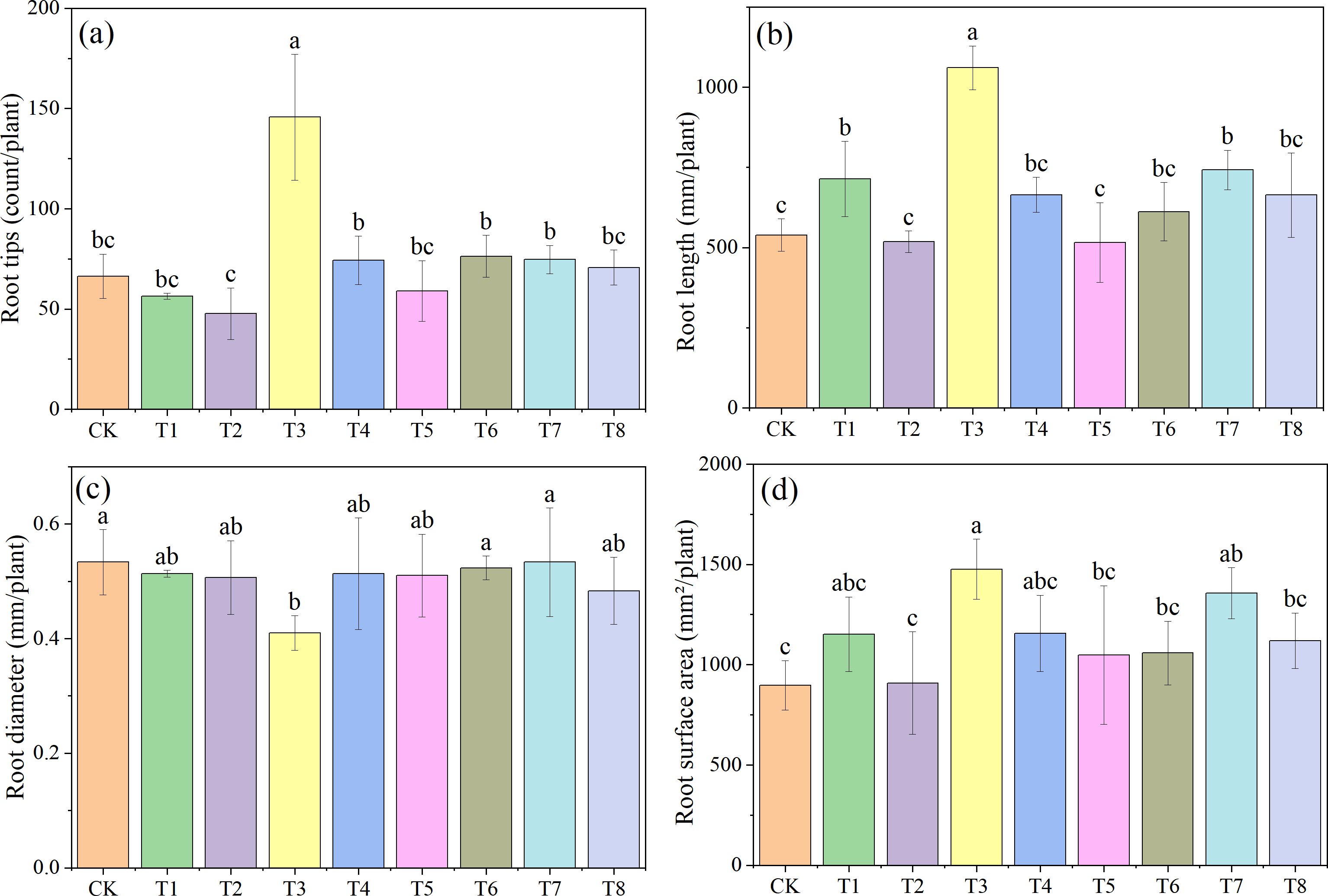 Figure 4. Effects of combined Mn and PE-MPs pollution on soybean root morphological traits: (A) root tips, (B) root length, (C) root diameter, and (D) root surface area. Different lowercase letters indicate significant differences among the different treatments (P < 0.05).