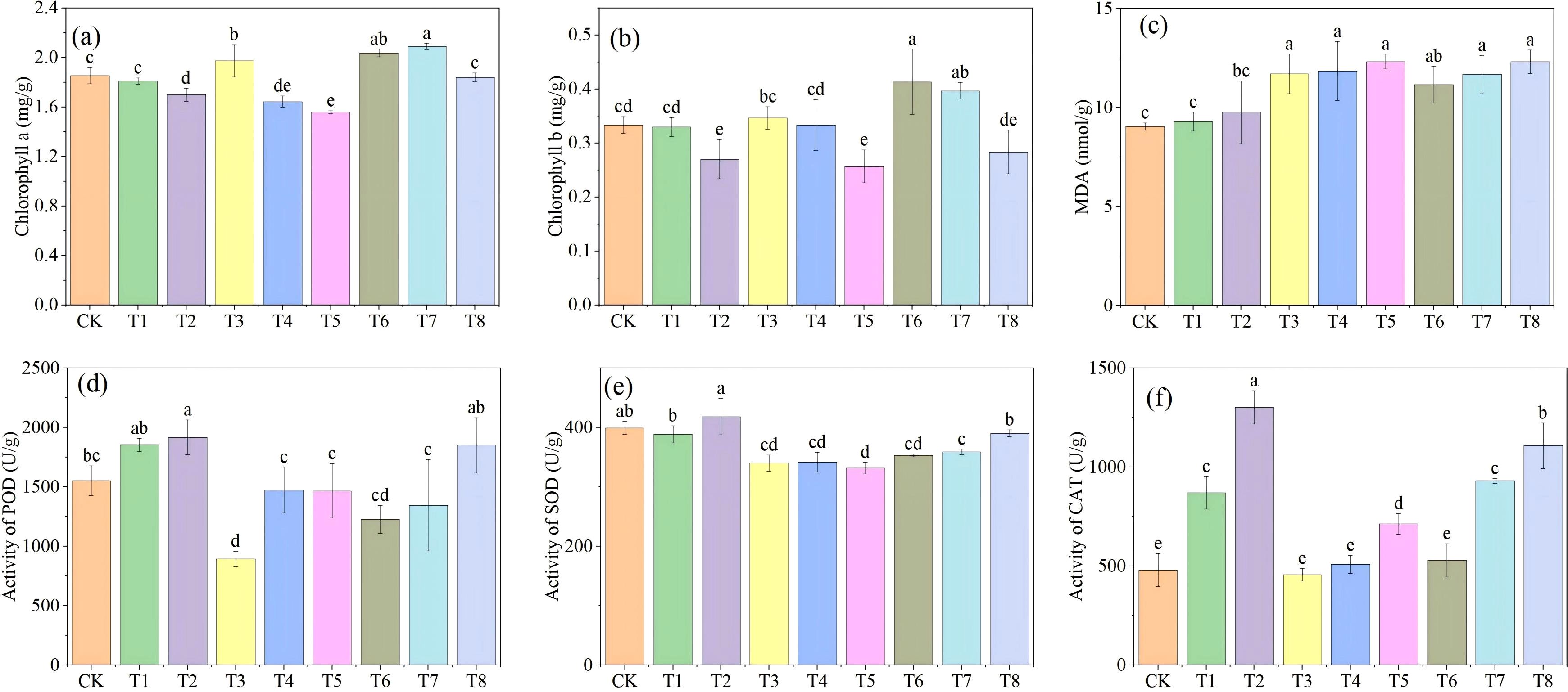 Chlorophyll was extracted with 95% ethanol, and the absorbance was measured at 649 nm and 665 nm (Luo et al., 2024). The chlorophyll a, chlorophyll b, and total chlorophyll contents were calculated. The malondialdehyde (MDA) content was determined using a plant MDA assay kit based on the thiobarbituric acid (TBA) method. The peroxidase (POD) activity was measured using a detection kit based on the guaiacol colorimetric method; the superoxide dismutase (SOD) activity was determined with a detection kit based on the nitroblue tetrazolium (NBT) riboflavin colorimetric method; and the catalase (CAT) activity was assayed by a detection kit based on the ultraviolet colorimetric method. These kits were purchased from Shanghai Yuanye Biotechnology Co., Ltd. To reduce errors, the samples required for determining each index were collected from the same horizontal position of the plants.