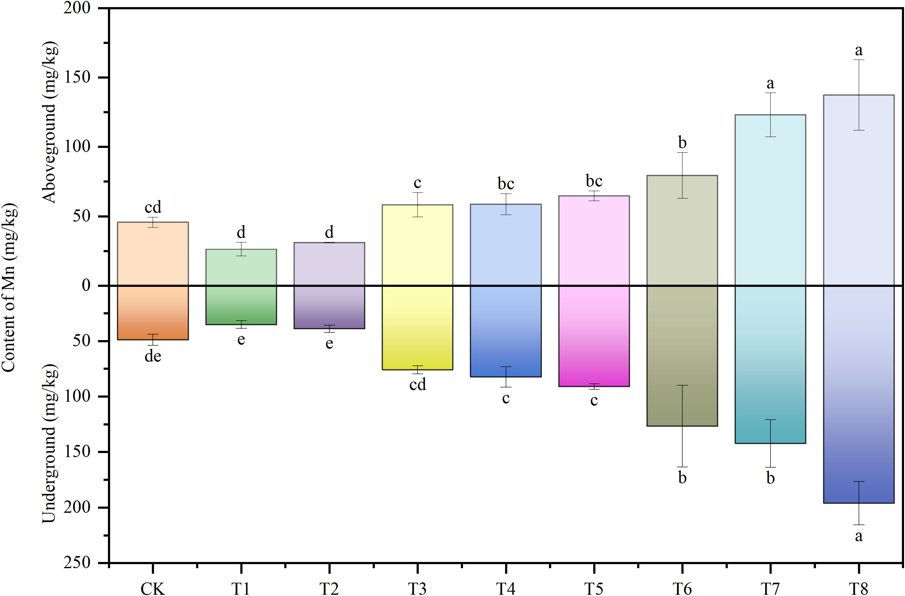 Determination of plant Mn: A 0.2 g sample of dried and crushed plant material was weighed and placed in a polytetrafluoroethylene digestion tank. Then, 3 mL of nitric acid was added, and after digestion in a drying oven at 160°C for 18 h, the mixture was digested on an electric hot plate at 200°C for 2 h. The lid was opened to drive off the acid until it was nearly dry. Finally, 1 mL of nitric acid was added to dissolve the residue, and the volume was made up to 25 mL with ultrapure water for testing.