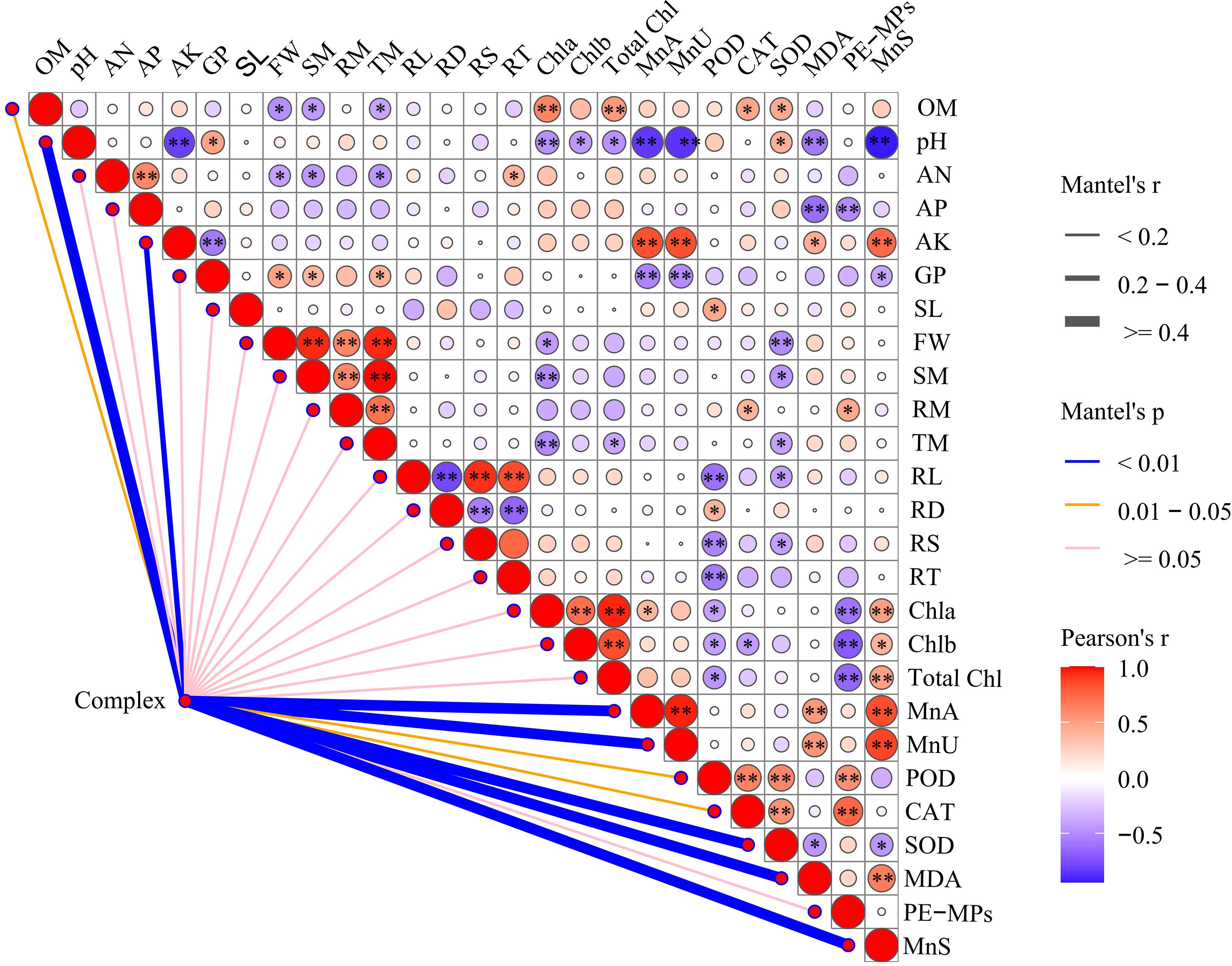 Figure 7. A correlation analysis of the combined pollution factor (Complex), soybean growth parameters, and soil nutrient dynamics. The size of the circle in the matrix denotes the value of the coefficient, with the red circles indicating positive correlations, and the blue circles representing negative correlations. The lines outside the matrix reveal the correlation of the combined pollution and soybean growth parameters, with thicker lines representing more significant correlations. Heat map of the Pearson’s correlation analysis of soybean growth parameters and soil nutrient dynamics. An asterisk (*) denotes a significant difference (P < 0.05), while double asterisks (**) indicate a highly significant difference (P < 0.01). Complex: combined Mn and PE-MPs pollution, OM: organic matter, AN: available nitrogen, AP: available phosphorus, AK: available potassium, GP: germination percentage, SL: shoot length, FW: fresh weight, SM: shoot biomass, RM: root biomass, TM: total biomass, RL: root length, RD: root diameter, RS: root surface area, RT: root tips, Chla: chlorophyll a, Chlb: chlorophyll b, Total Chl: total chlorophyll, MnA: Mn in the aboveground part, MnU: Mn in underground part, POD: peroxisome, CAT: catalase, SOD: superoxide dismutase, MDA: malondialdehyde, MnS: Mn in soil.
